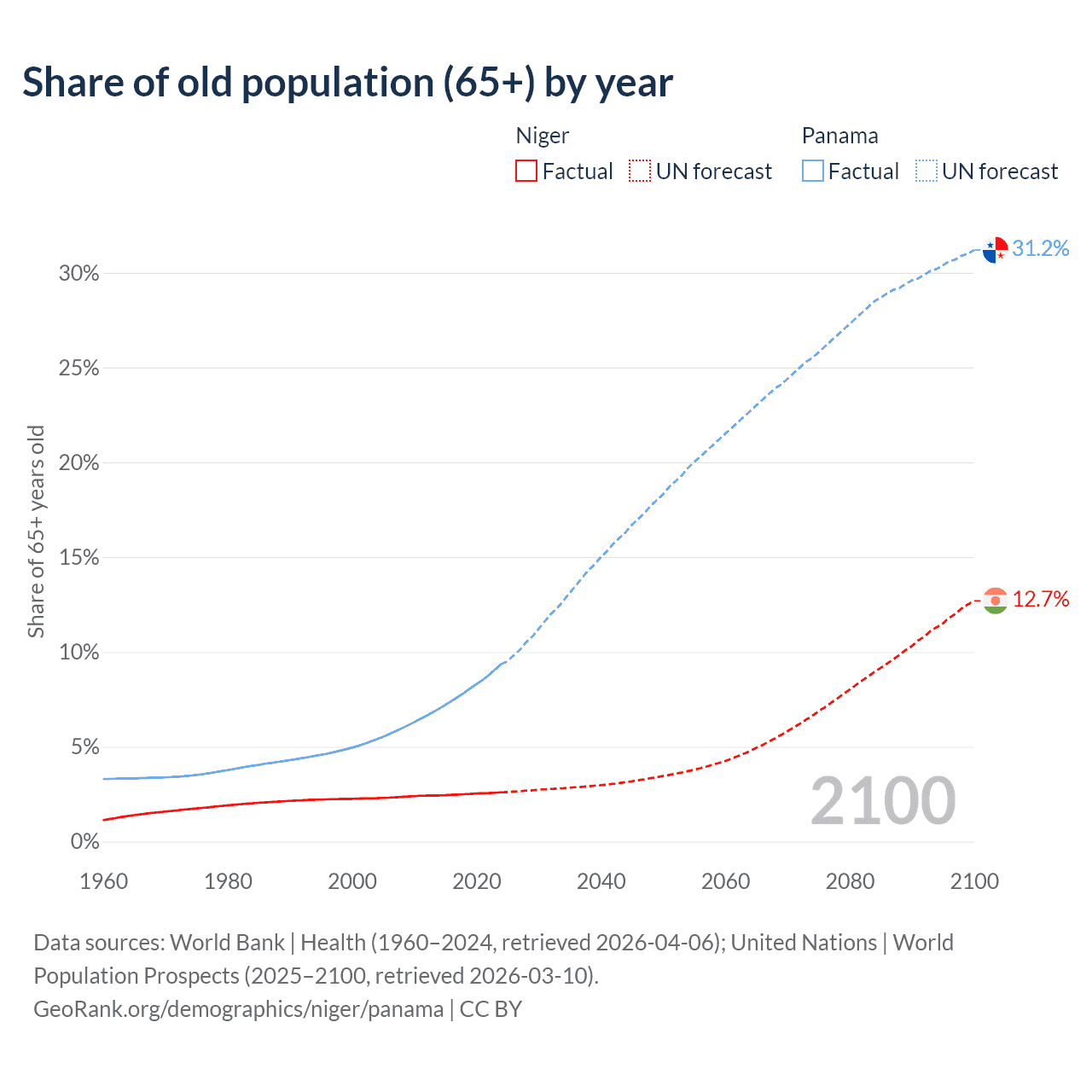 The share of older people aged 65 and over is 2.59% in Niger and 9.35% in Panama. Life expectancy in Niger compared to Panama .