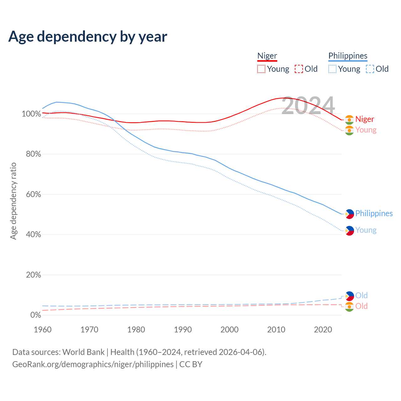 - The share of old-age demographic (65+) in Niger is 2.59% vs 5.49% in the Philippines.