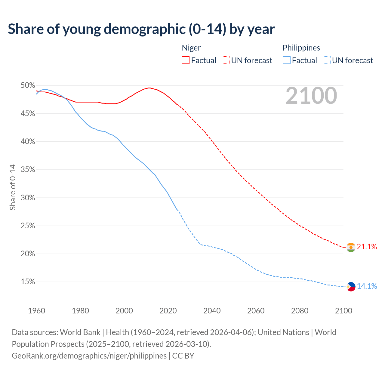 - The share of young demographic (0-15 years old) in Niger is 46.6% vs 27.9% in the Philippines.