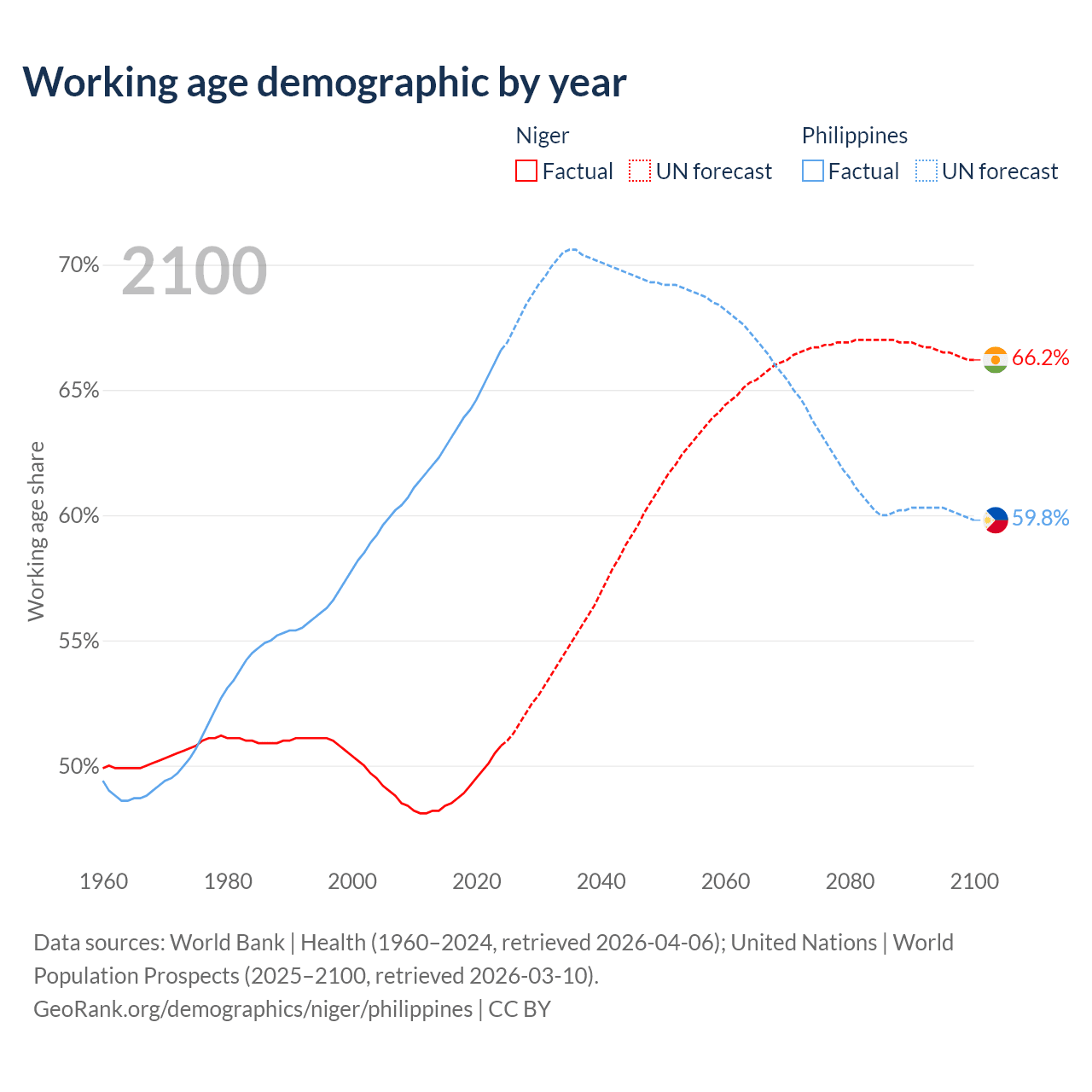 The share of older people aged 65 and over is 2.59% in Niger and 5.49% in the Philippines. Life expectancy in Niger compared to the Philippines .