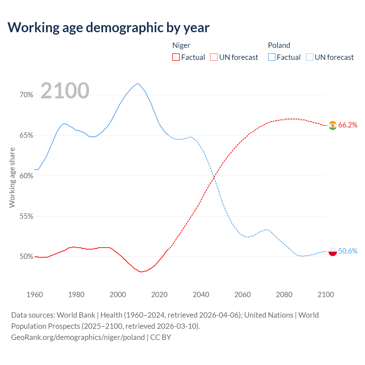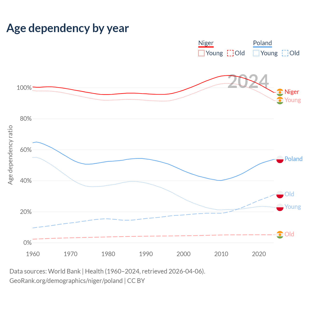 The share of older people aged 65 and over is 2.59% in Niger and 20.1% in Poland. Life expectancy in Niger compared to Poland .