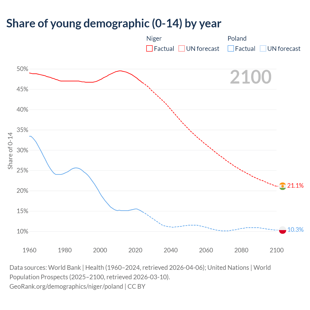- The share of young demographic (0-15 years old) in Niger is 46.6% vs 14.8% in Poland.