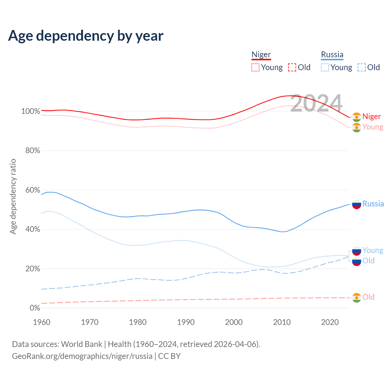 - The share of old-age demographic (65+) in Niger is 2.59% vs 17.2% in Russia.