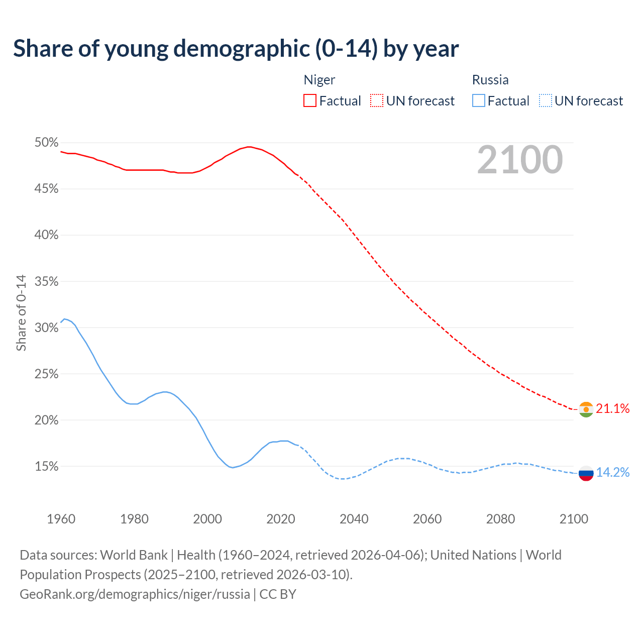 - The share of young demographic (0-15 years old) in Niger is 46.6% vs 17.3% in Russia.