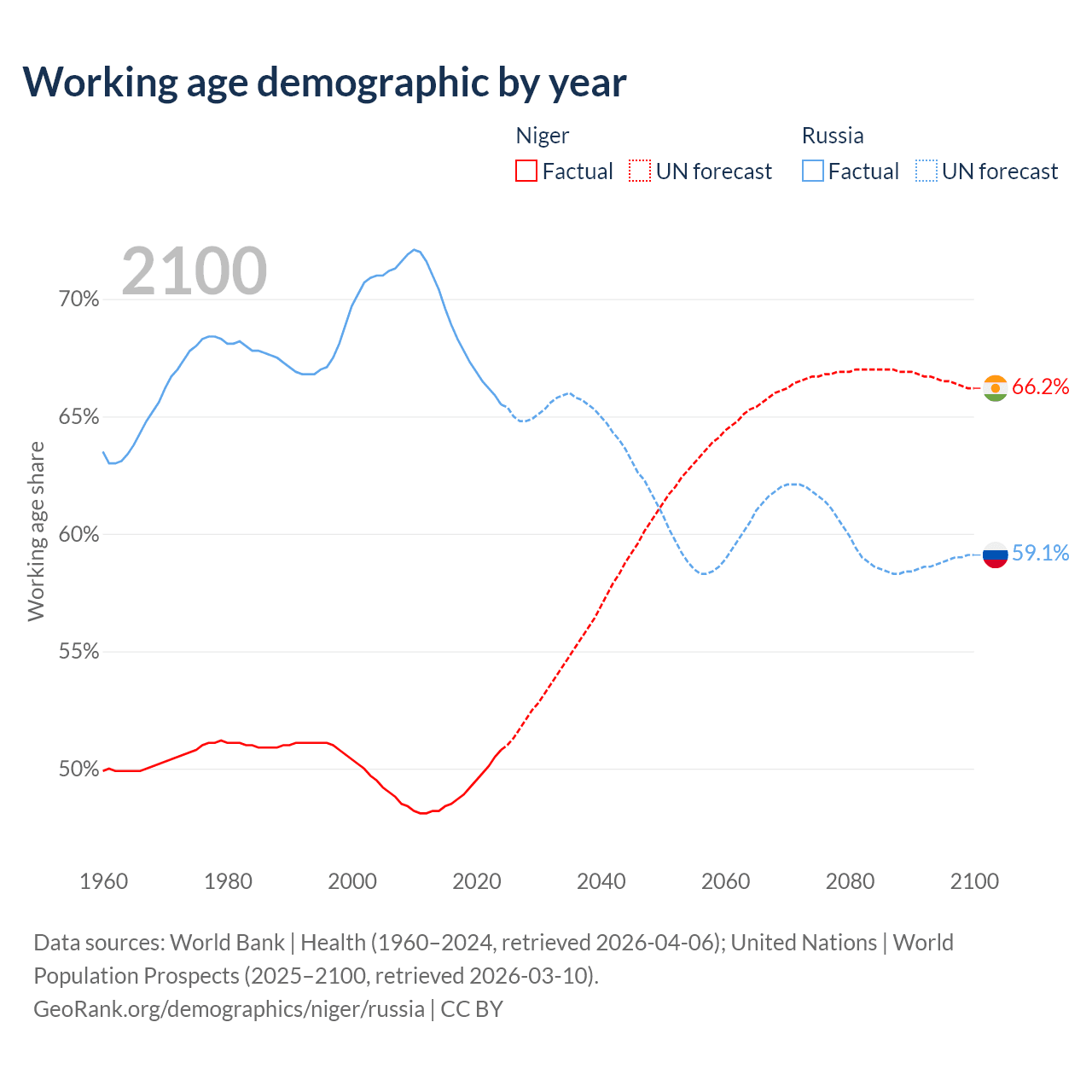 - Niger has 14.8M working age adults (aged 15-64) vs 93M in Russia.