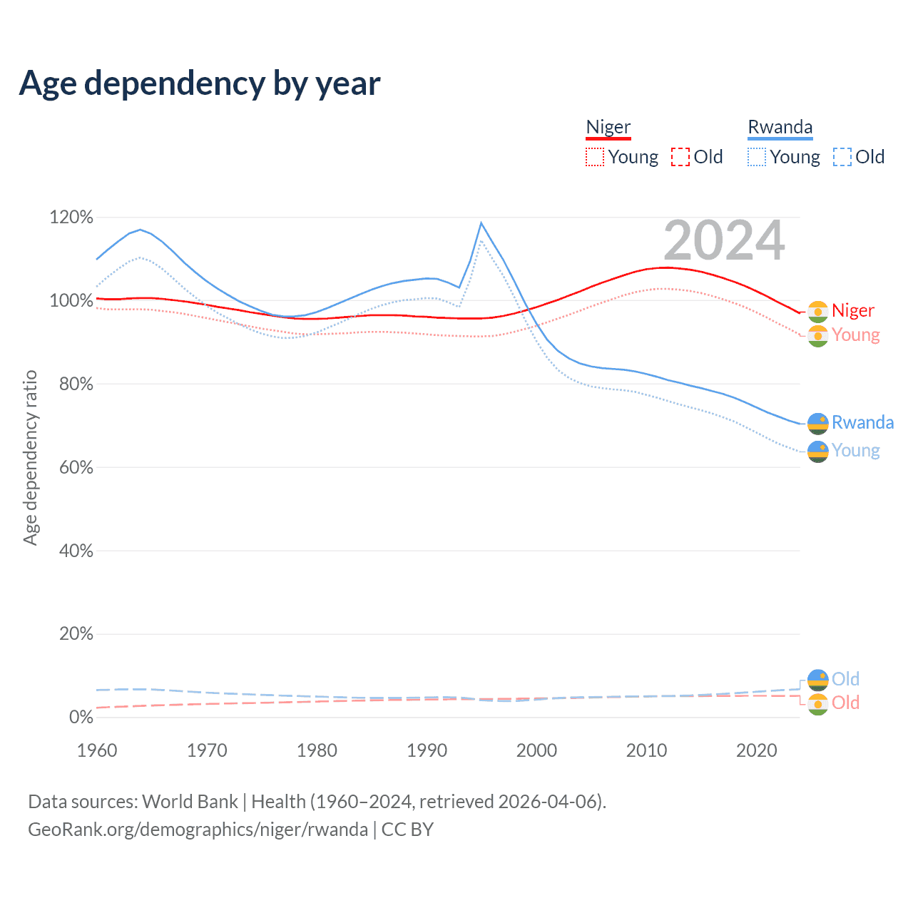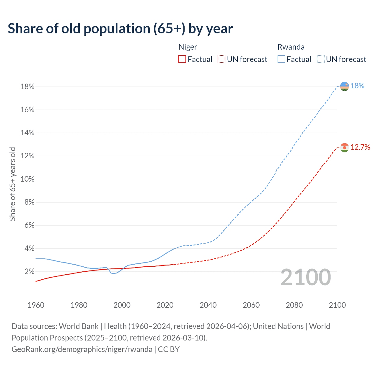 - The share of old-age demographic (65+) in Niger is 2.59% vs 3.93% in Rwanda.