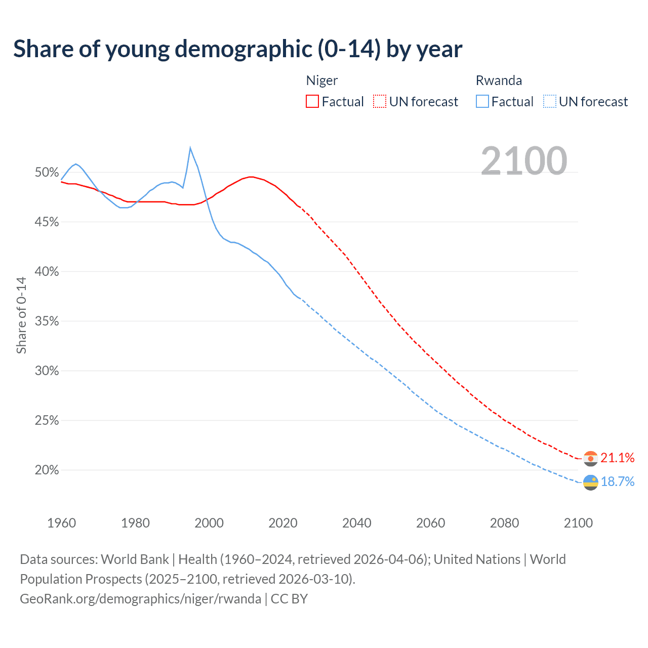 - The share of young demographic (0-15 years old) in Niger is 46.6% vs 37.4% in Rwanda.
