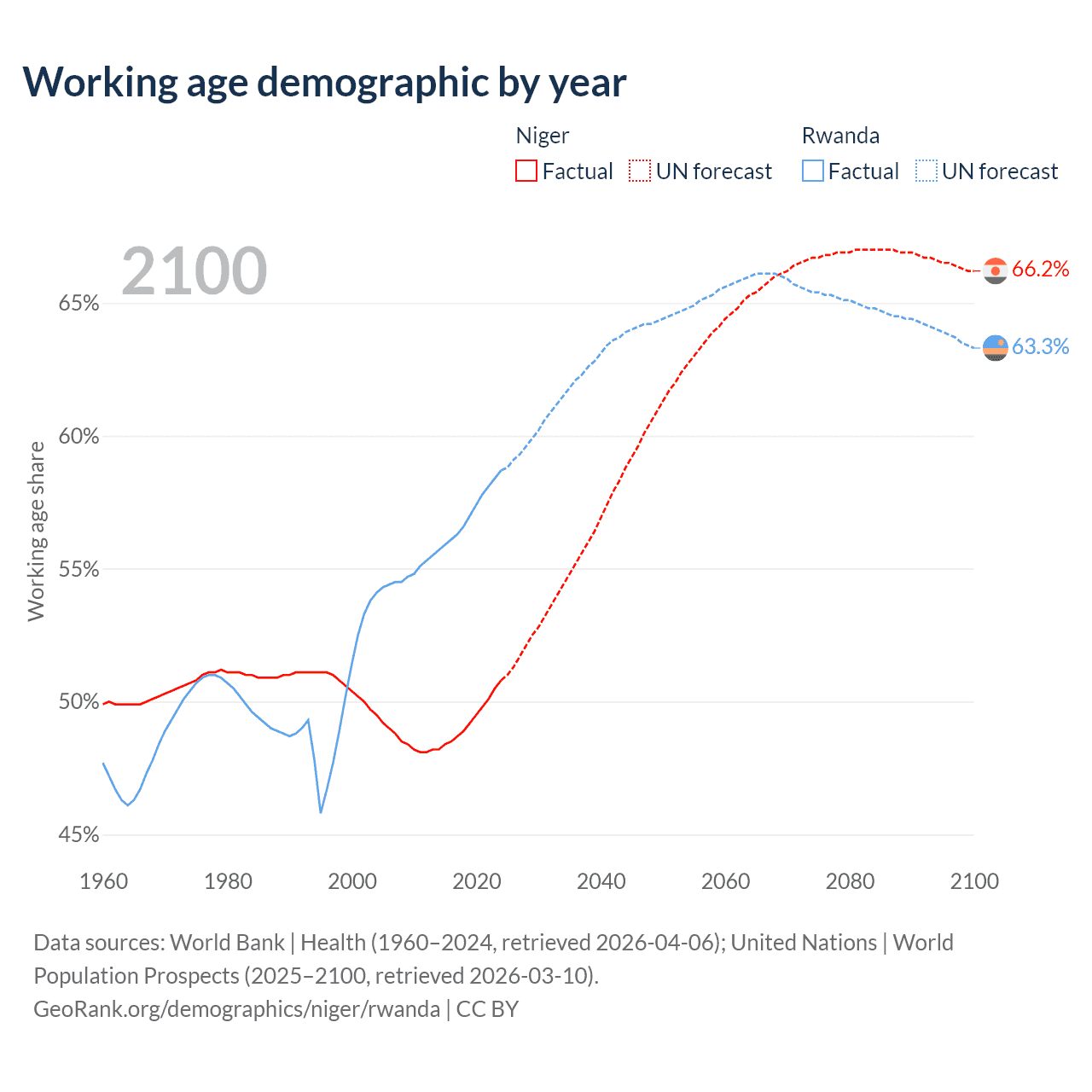 - Niger has 14.8M working age adults (aged 15-64) vs 8.79M in Rwanda.