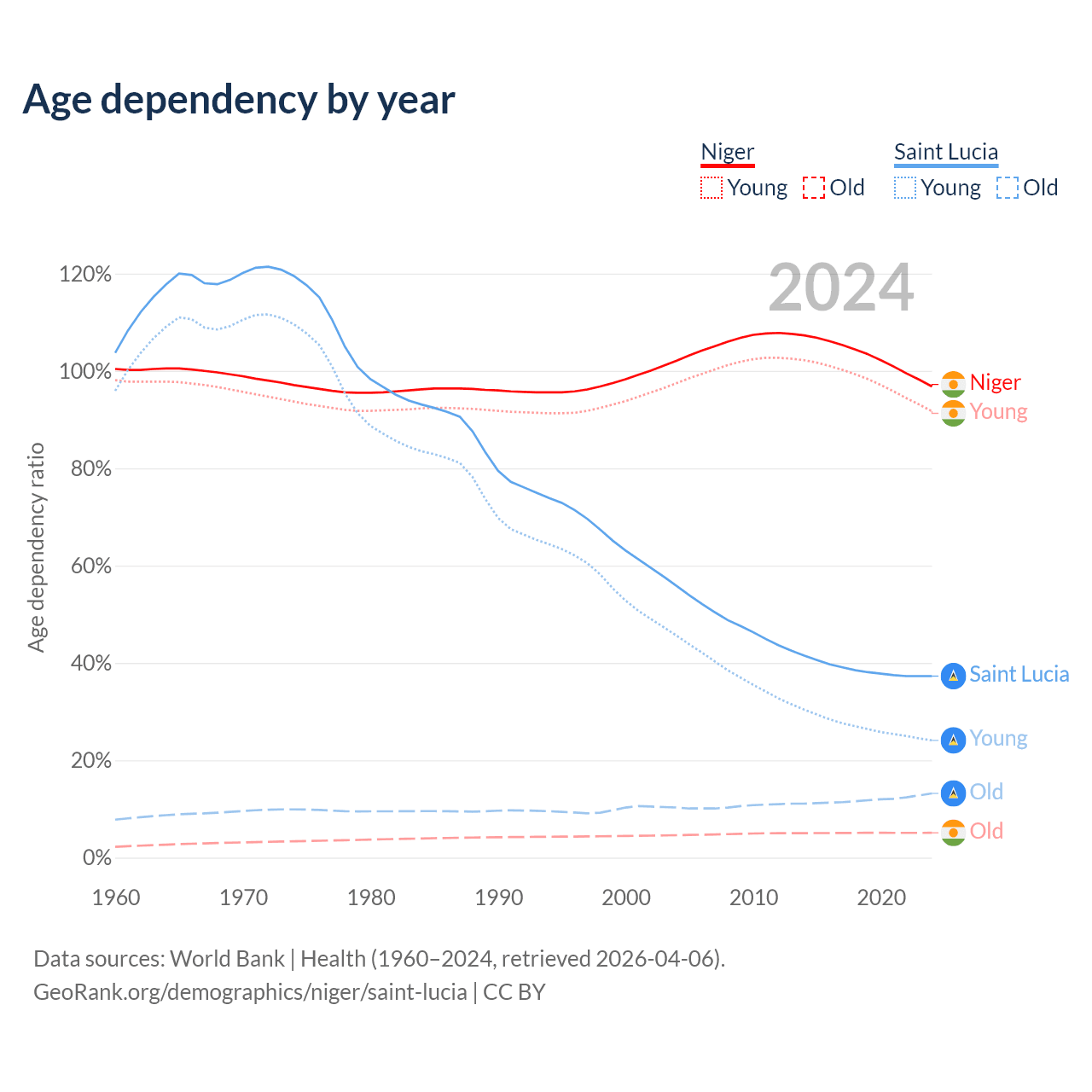 - The share of old-age demographic (65+) in Niger is 2.59% vs 9.62% in Saint Lucia.