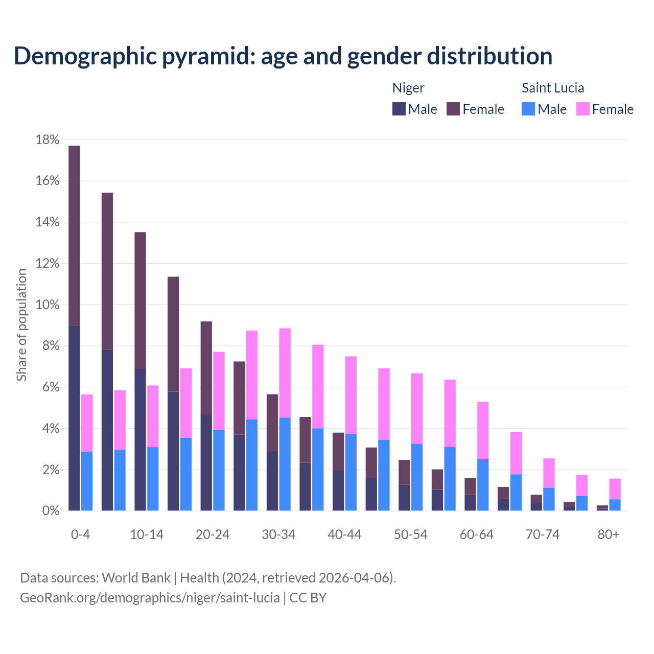 - Niger is ranked 195/196 by median age (oldest to youngest) vs 74/196 for Saint Lucia.