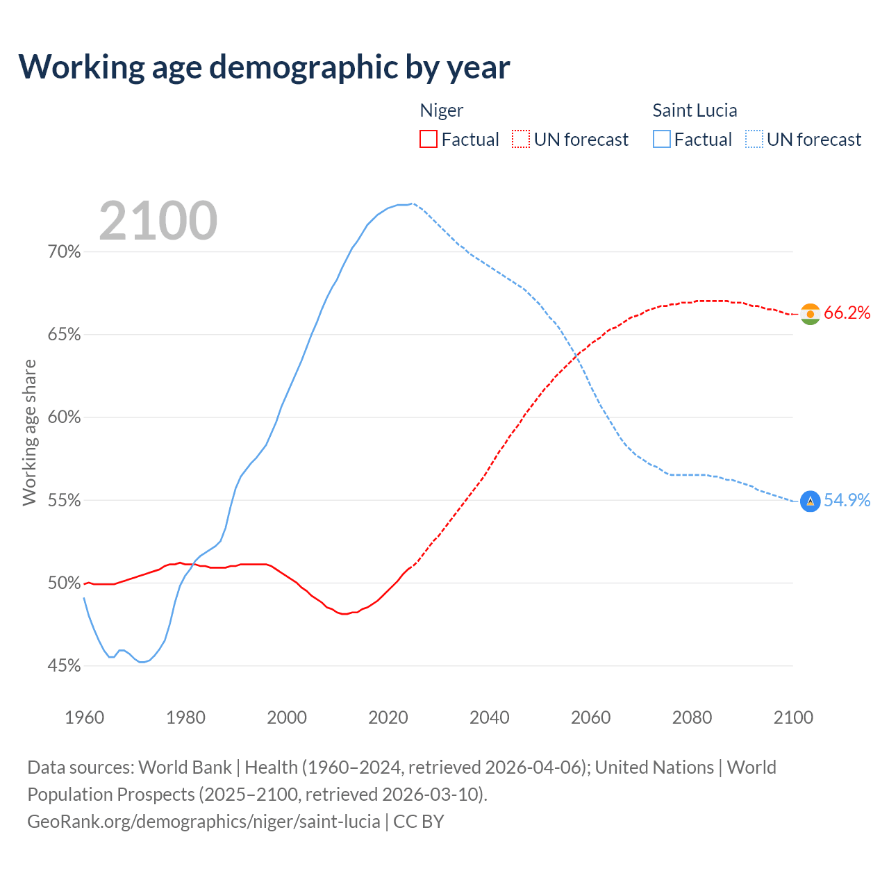- The share of young demographic (0-15 years old) in Niger is 46.6% vs 17.5% in Saint Lucia.