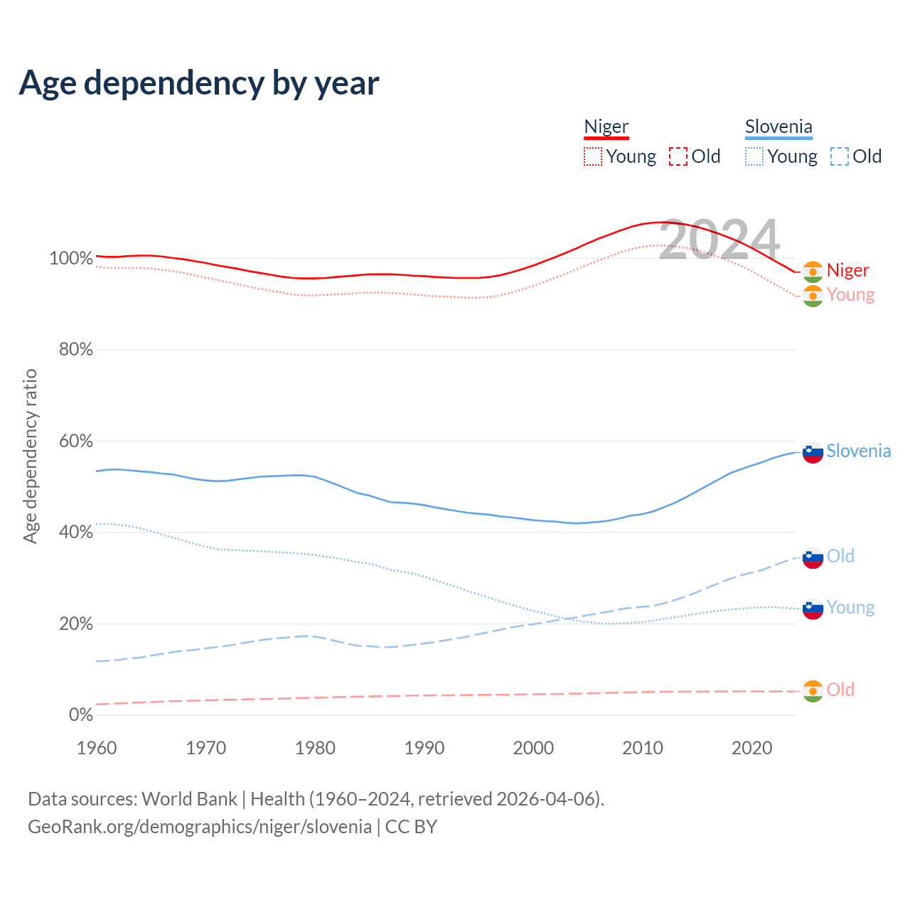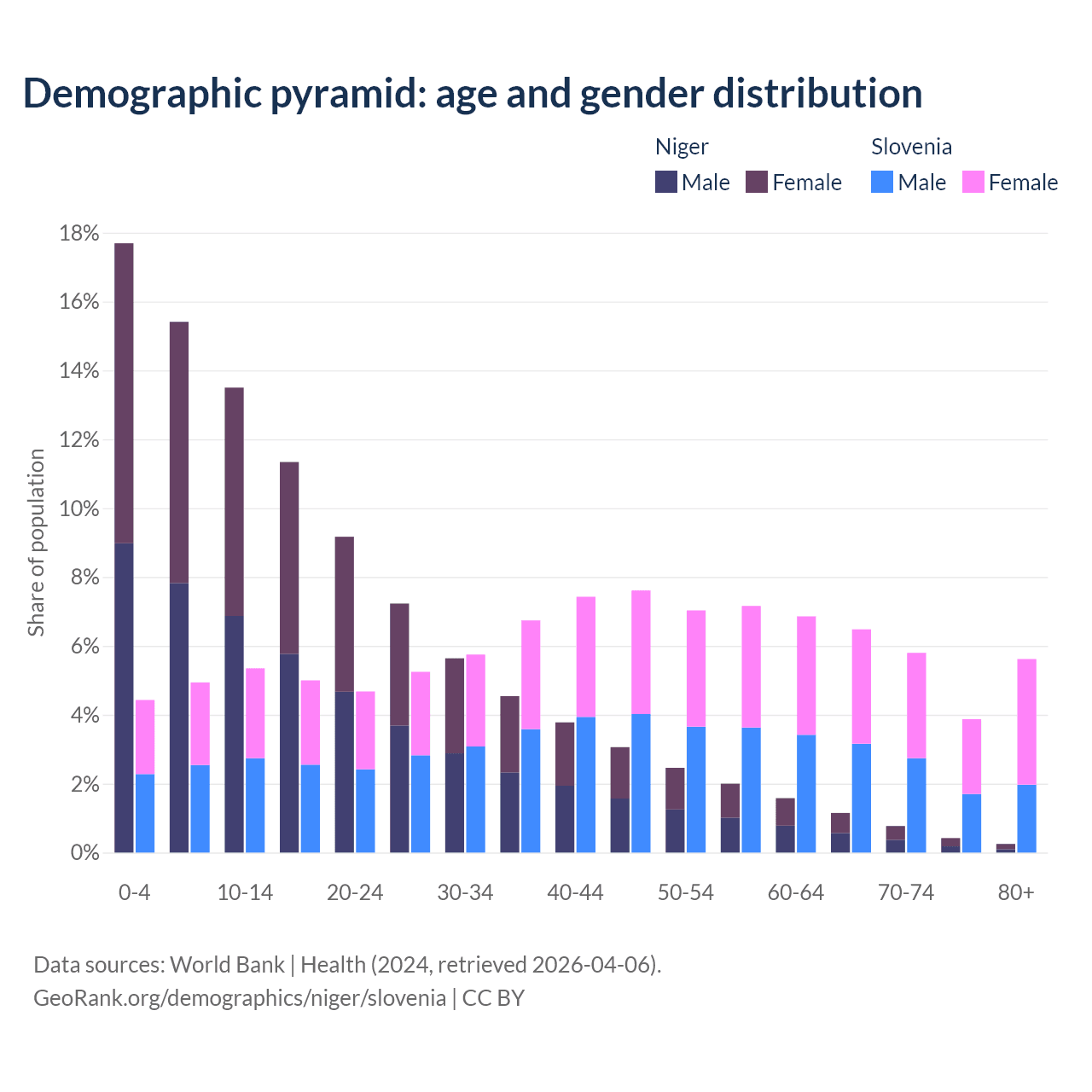 - The share of old-age demographic (65+) in Niger is 2.59% vs 21.8% in Slovenia.
