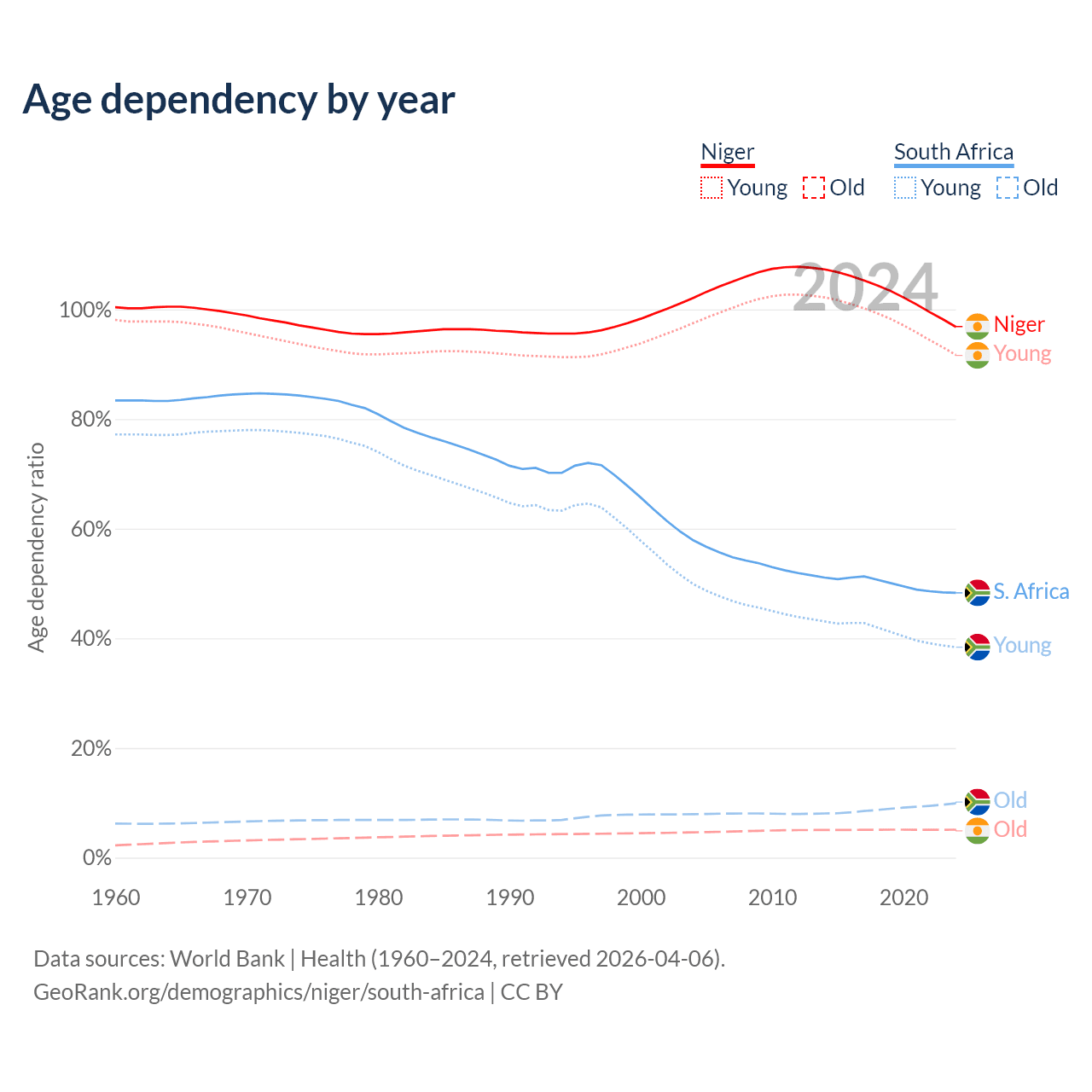 The share of older people aged 65 and over is 2.59% in Niger and 6.69% in South Africa. Life expectancy in Niger compared to South Africa .