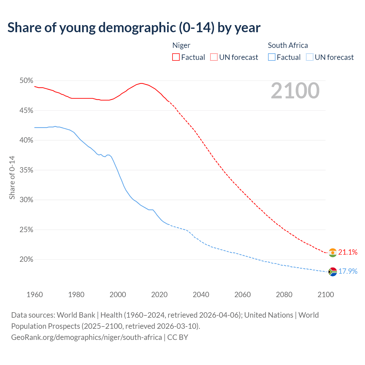 Median age Niger vs South Africa, 1960-2100