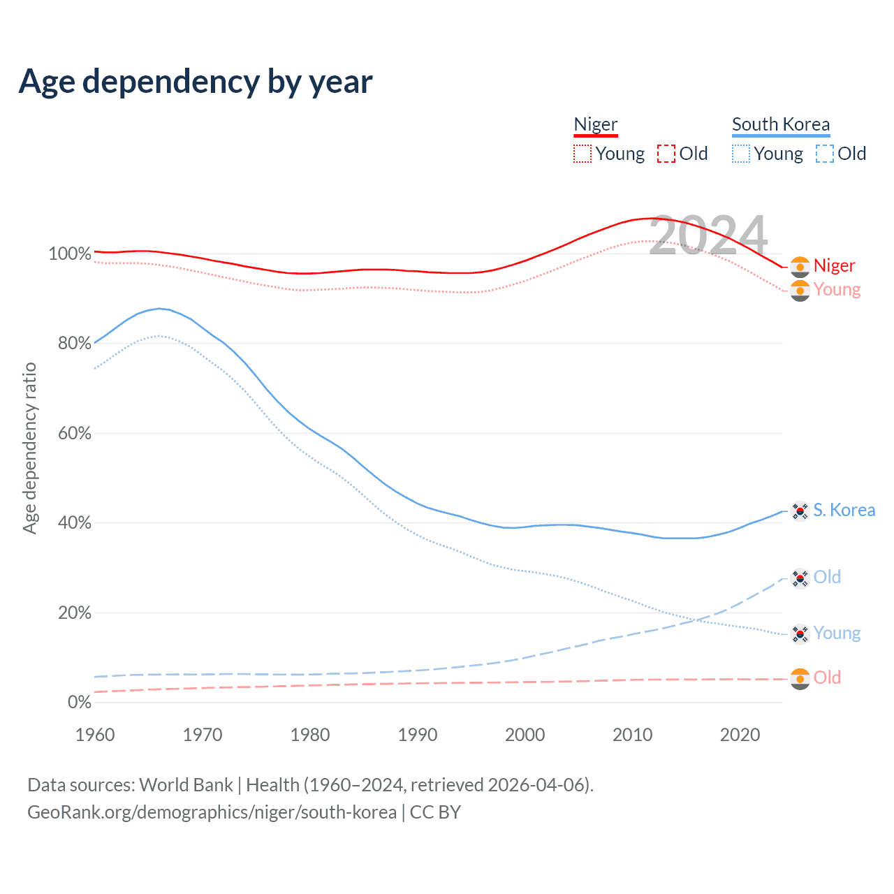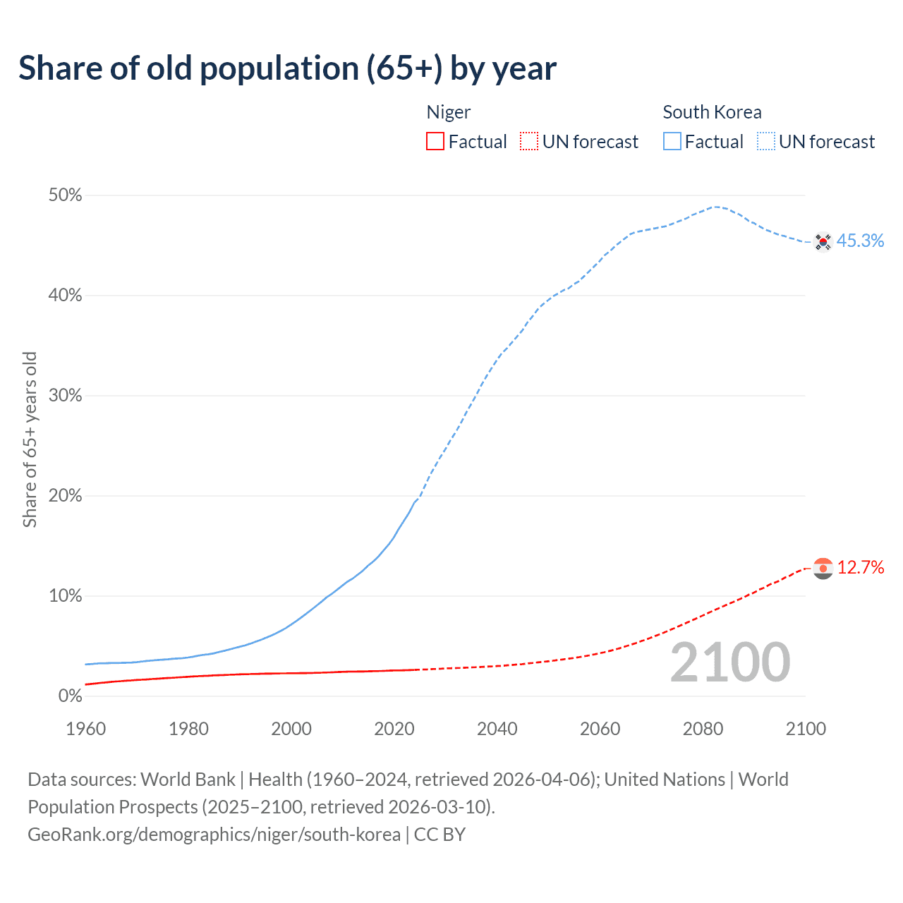 The share of older people aged 65 and over is 2.59% in Niger and 19.3% in South Korea. Life expectancy in Niger compared to South Korea .