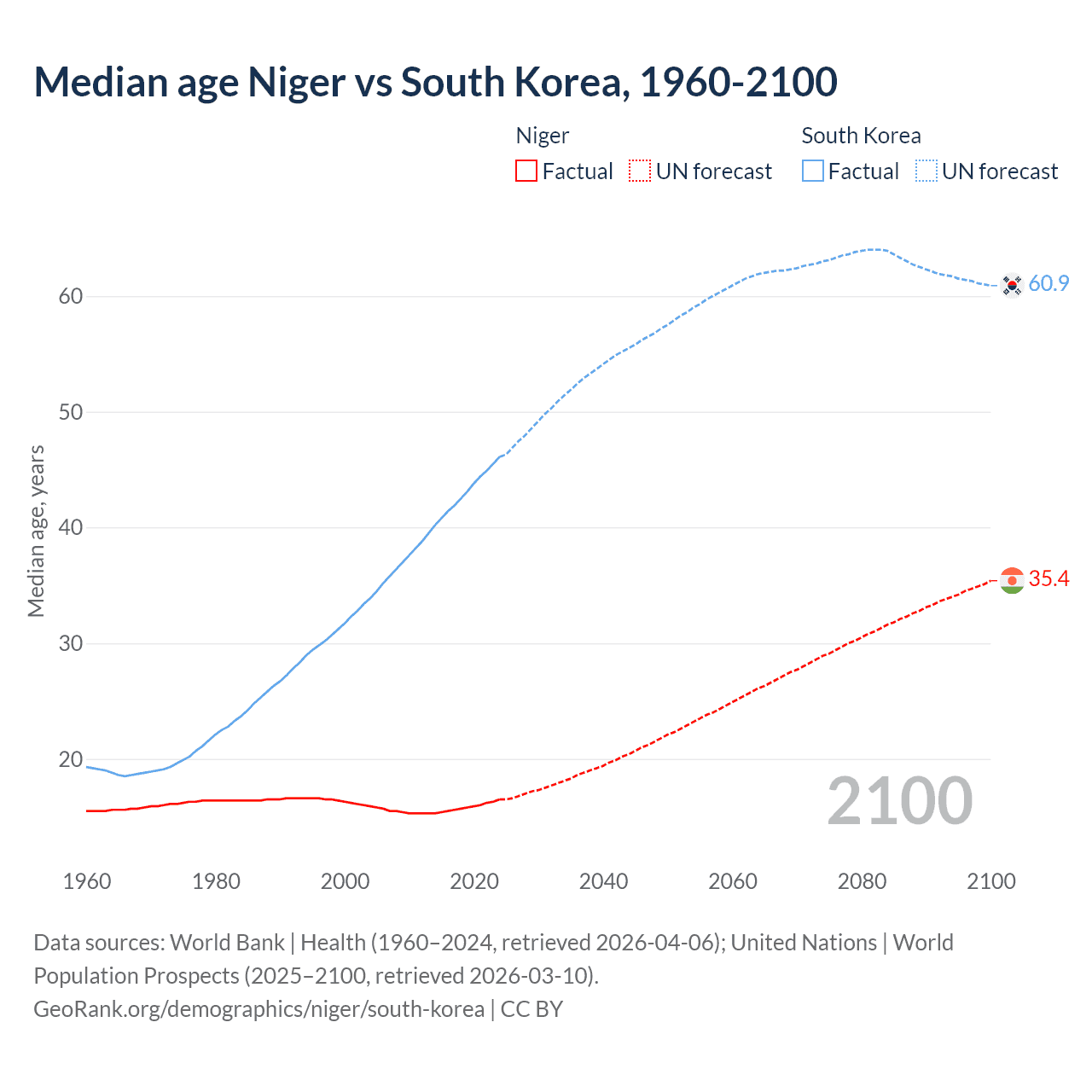 Median age Niger vs South Korea, 1960-2100
