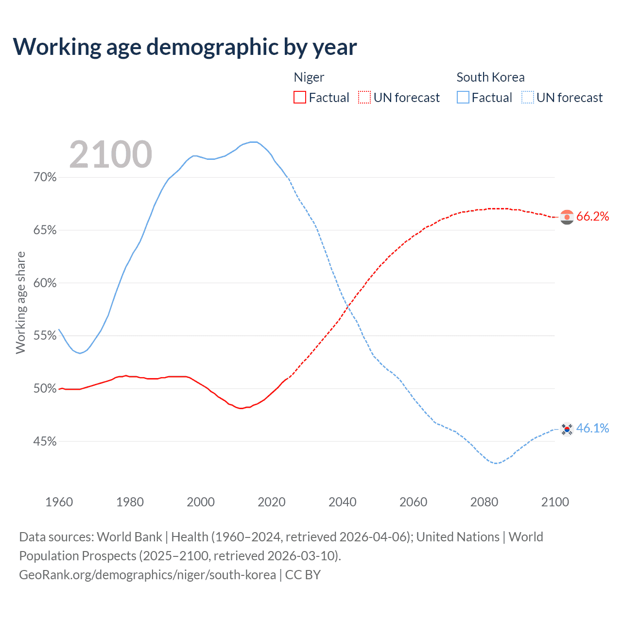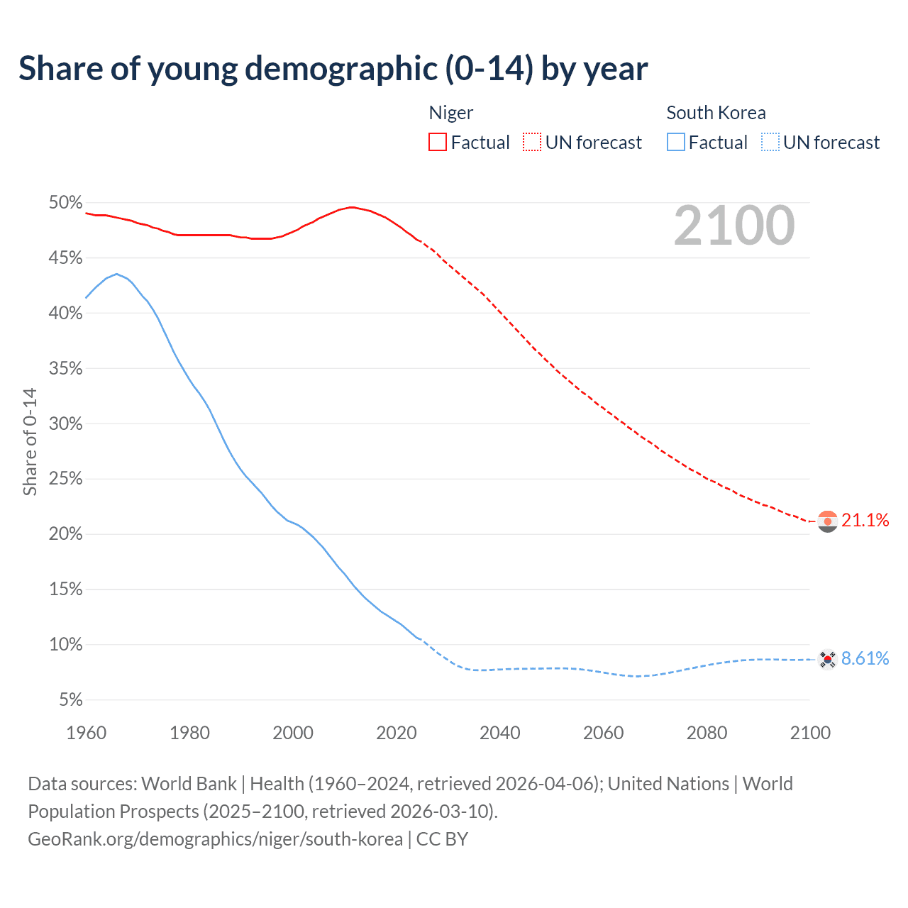 - The share of young demographic (0-15 years old) in Niger is 46.6% vs 10.6% in South Korea.