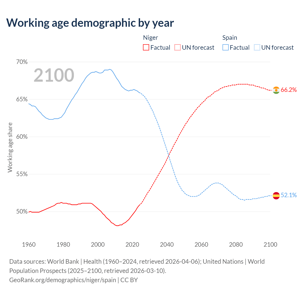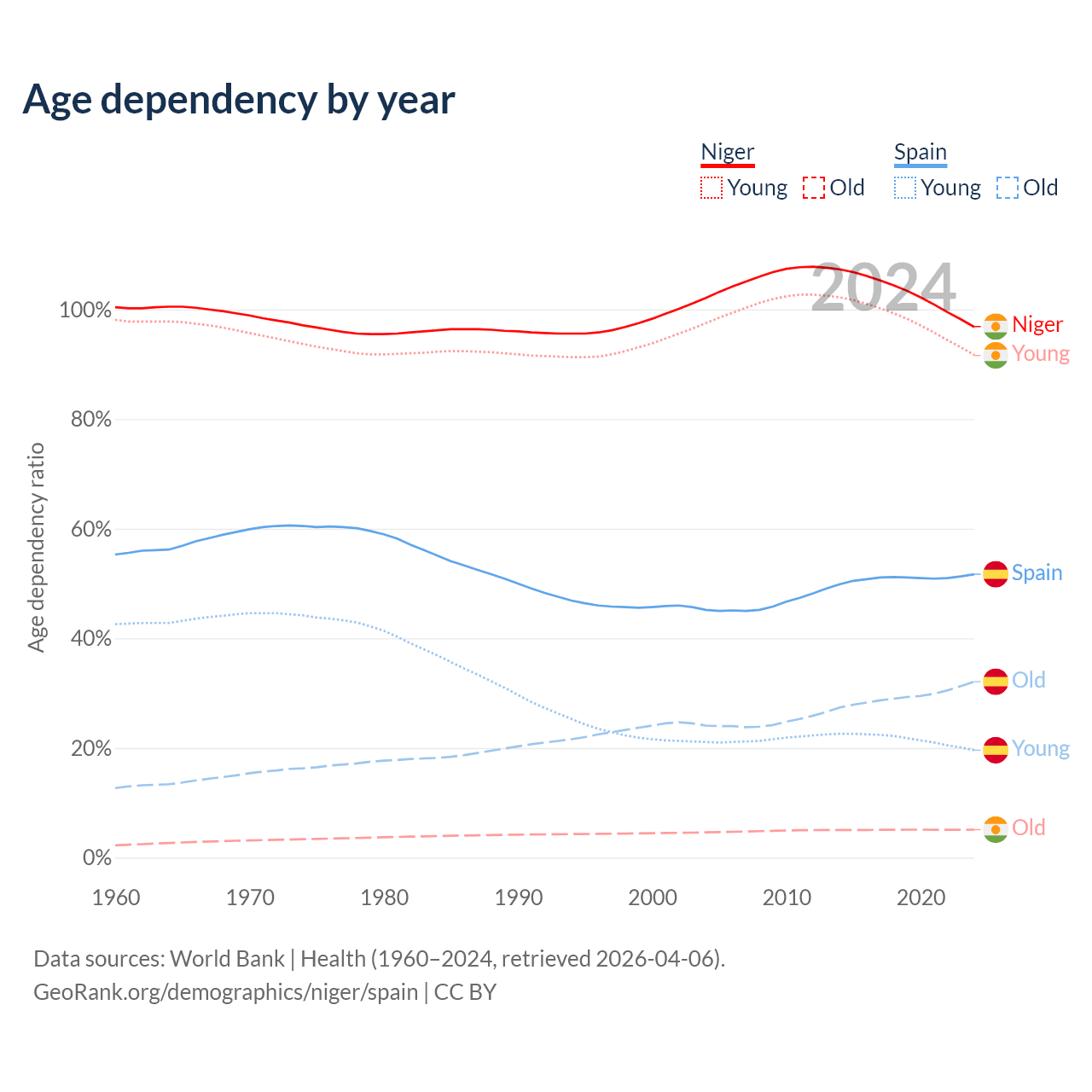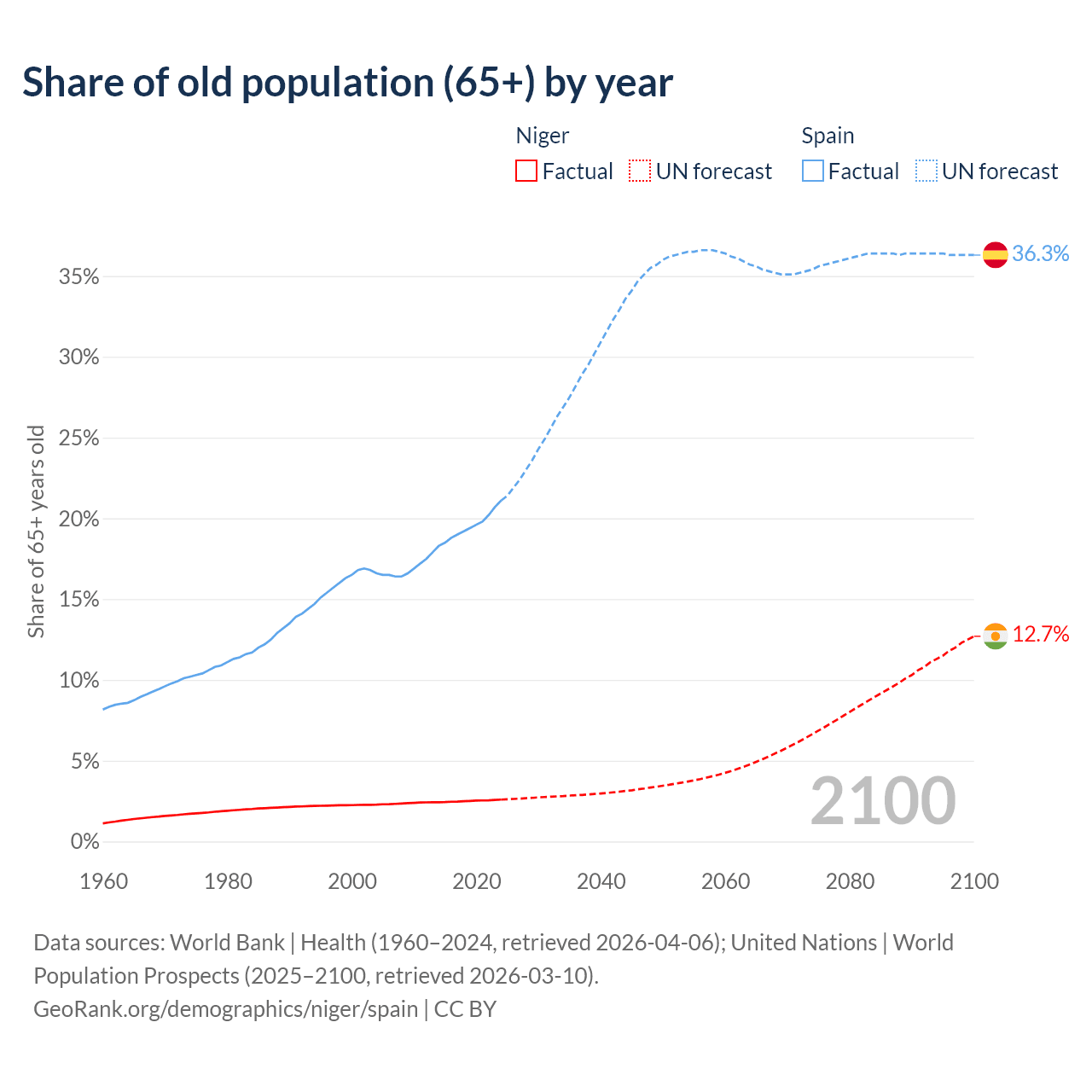 The share of older people aged 65 and over is 2.59% in Niger and 21.1% in Spain. Life expectancy in Niger compared to Spain .