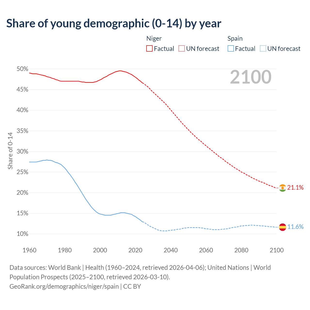 - The share of young demographic (0-15 years old) in Niger is 46.6% vs 12.9% in Spain.