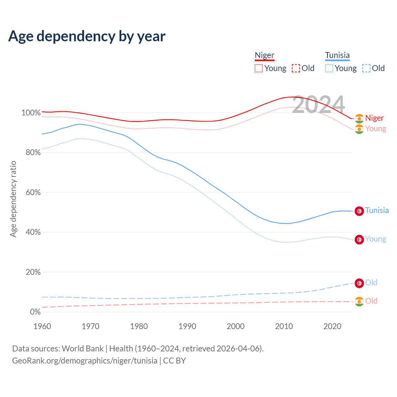 - The share of old-age demographic (65+) in Niger is 2.59% vs 9.53% in Tunisia.