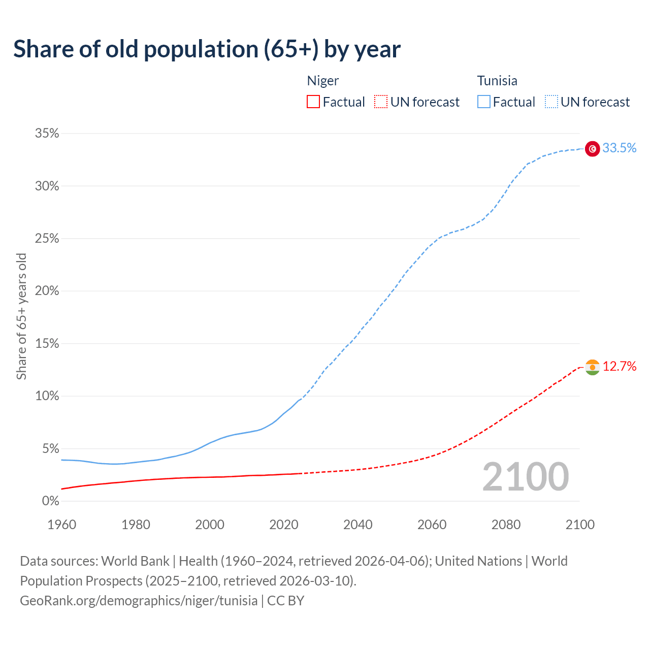 The share of older people aged 65 and over is 2.59% in Niger and 9.53% in Tunisia. Life expectancy in Niger compared to Tunisia .