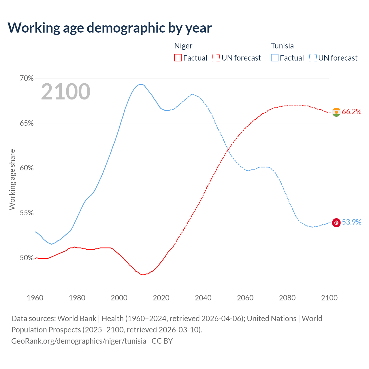 - Niger has 14.8M working age adults (aged 15-64) vs 8.26M in Tunisia.