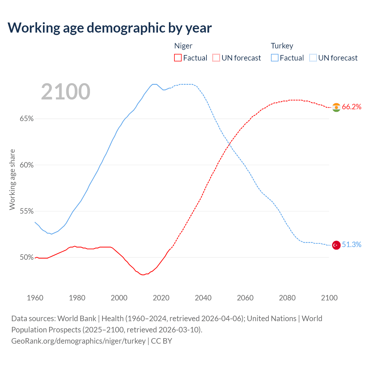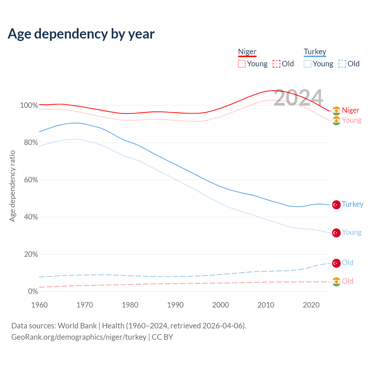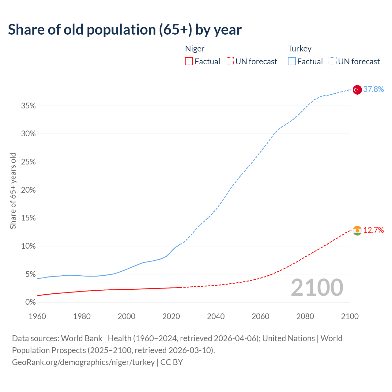The share of older people aged 65 and over is 2.59% in Niger and 10.3% in Turkey. Life expectancy in Niger compared to Turkey .