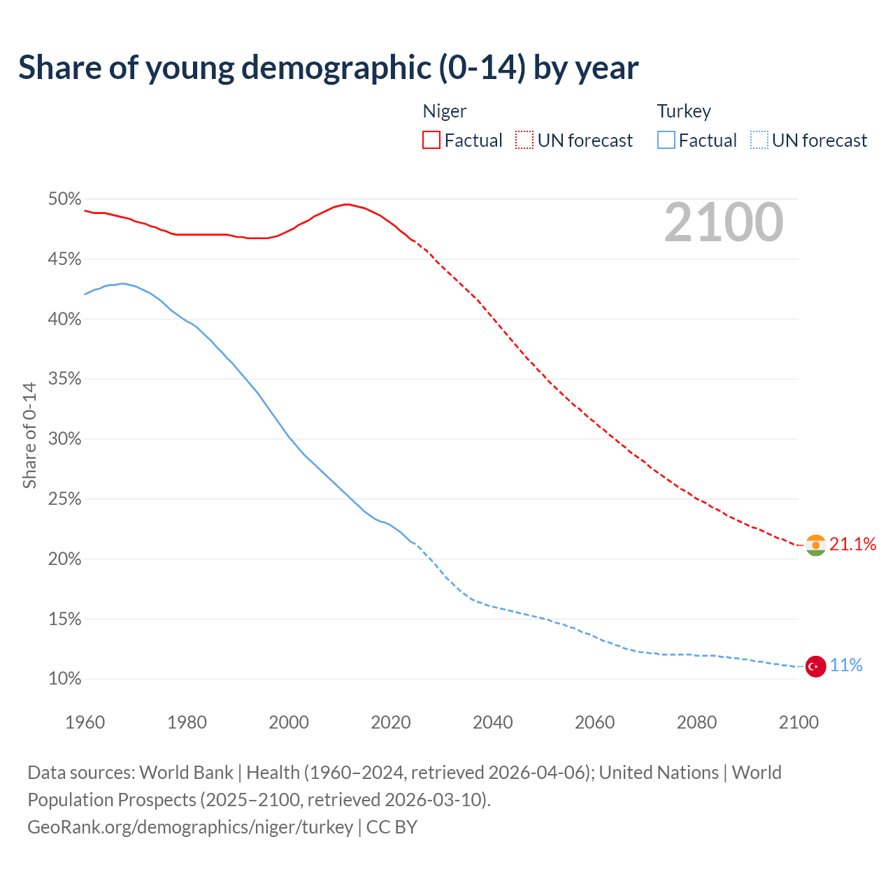 - The share of young demographic (0-15 years old) in Niger is 46.6% vs 21.4% in Turkey.