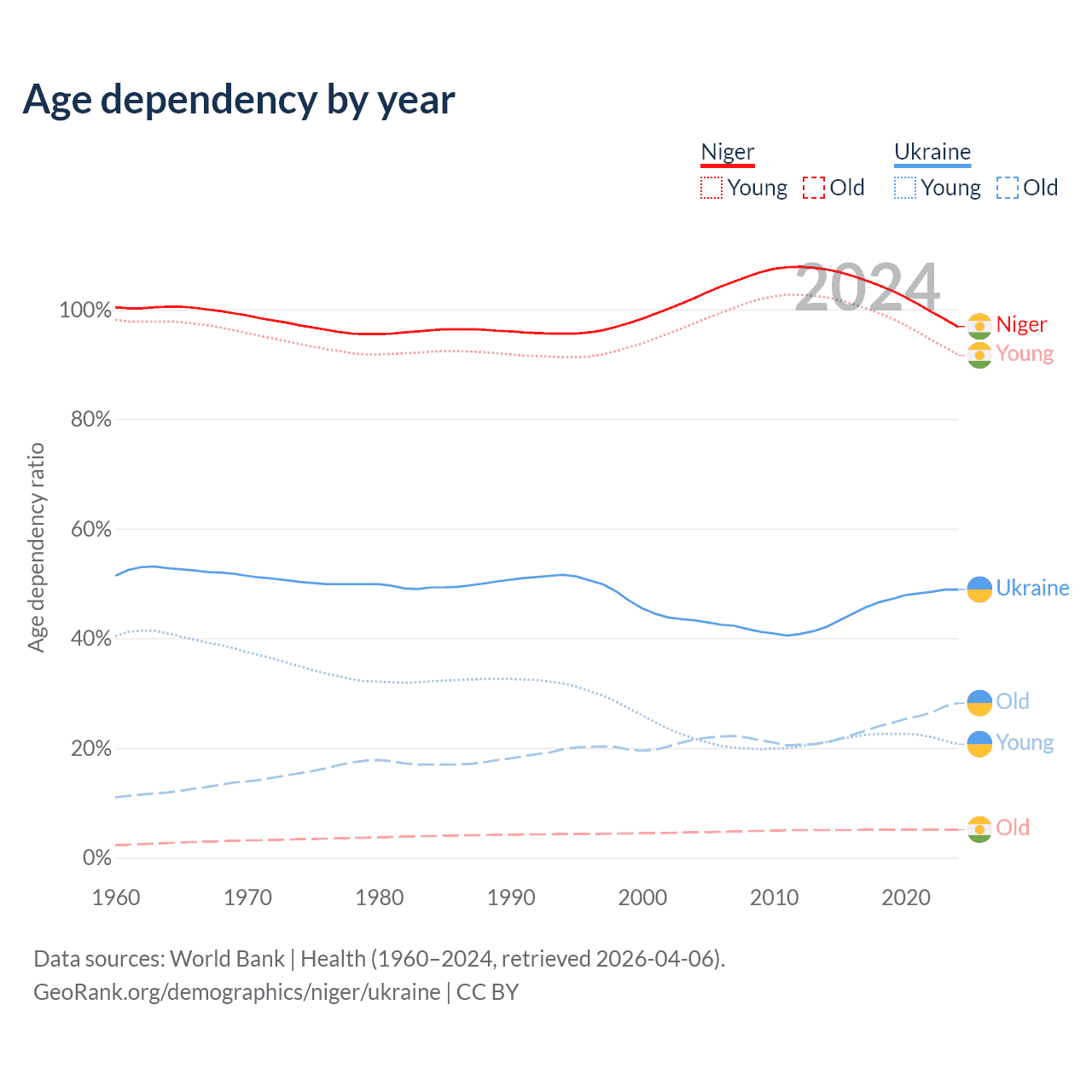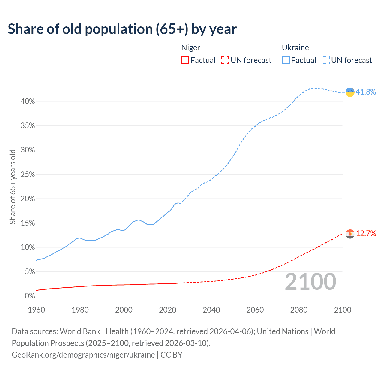 - The share of old-age demographic (65+) in Niger is 2.59% vs 19% in Ukraine.