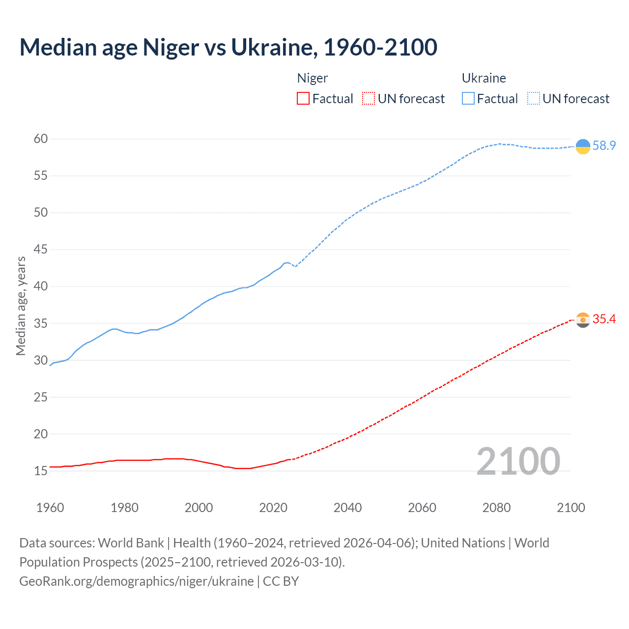 - Niger is ranked 195/196 by median age (oldest to youngest) vs 26/196 for Ukraine.