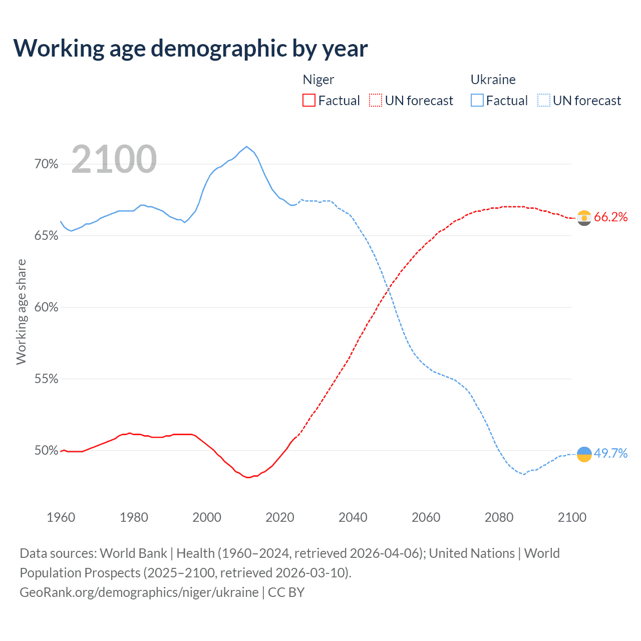 - Niger has 14.8M working age adults (aged 15-64) vs 26.9M in Ukraine.