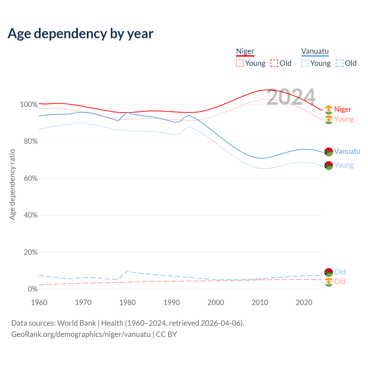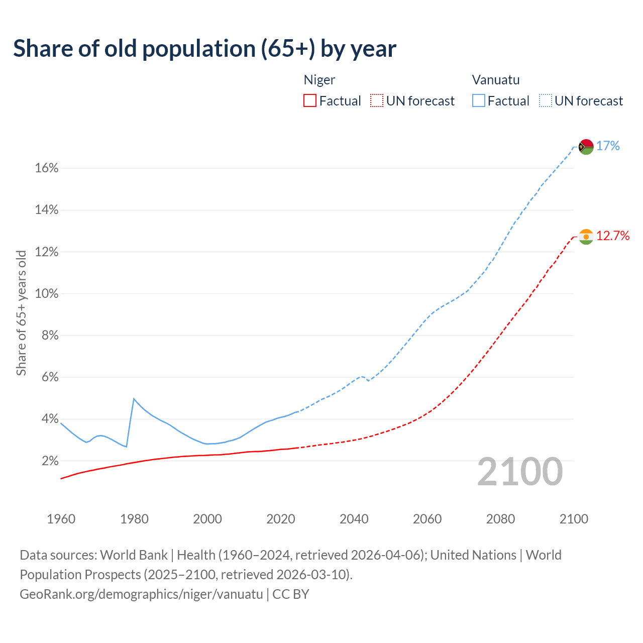 - The share of old-age demographic (65+) in Niger is 2.59% vs 4.3% in Vanuatu.