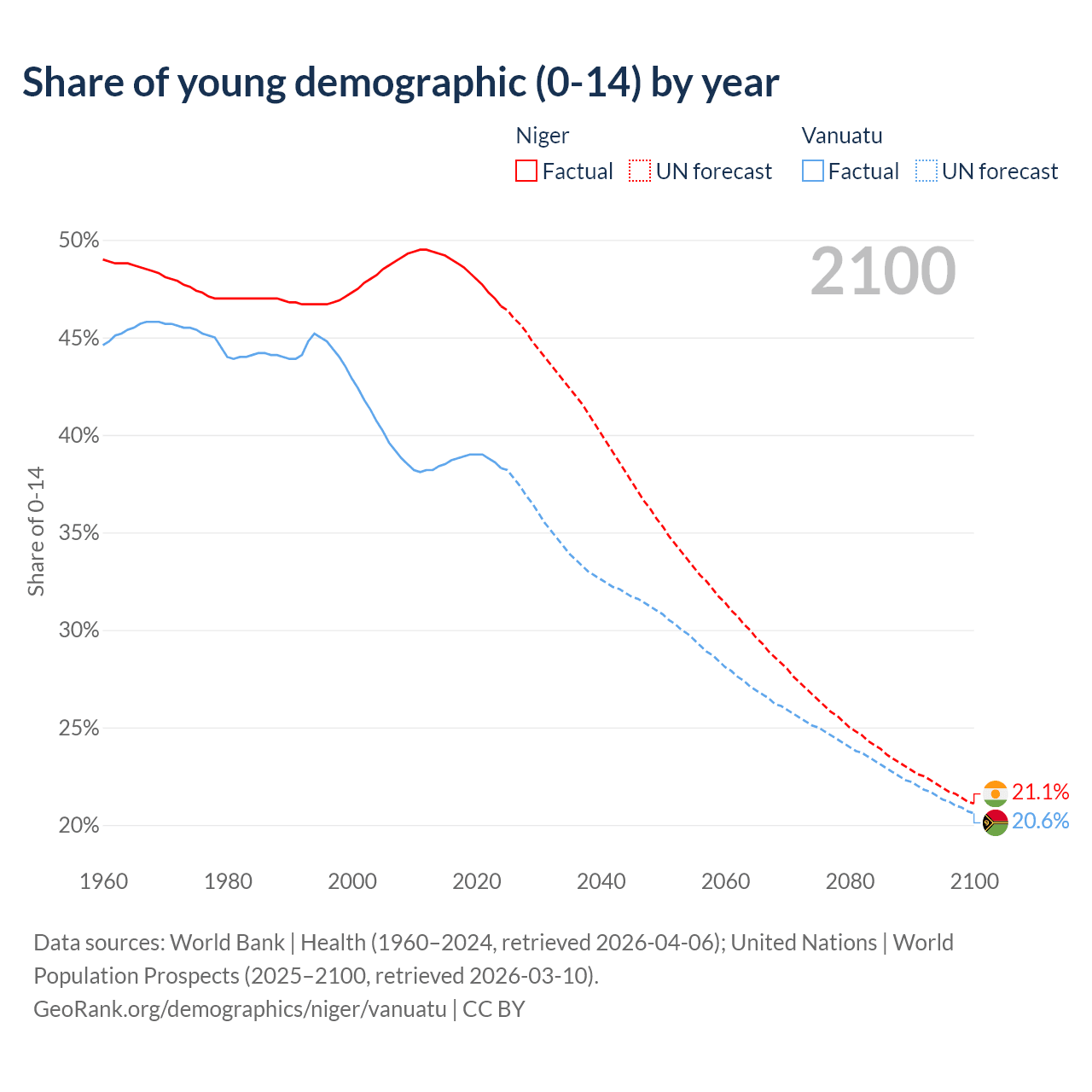 - The share of young demographic (0-15 years old) in Niger is 46.6% vs 38.3% in Vanuatu.
