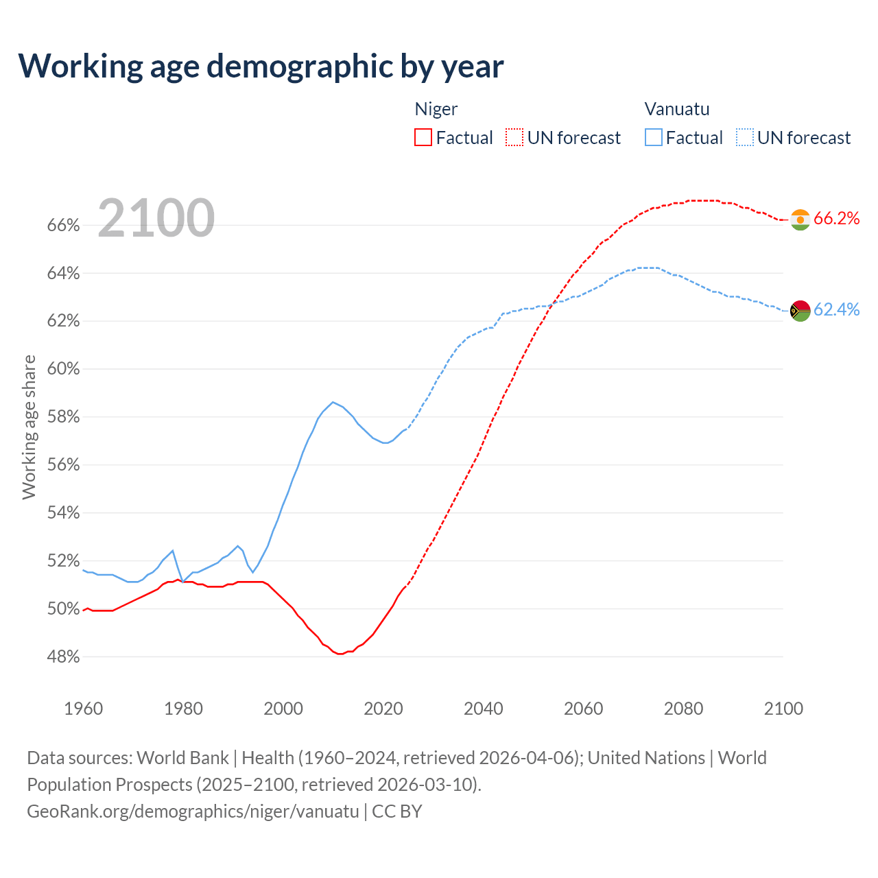 - Niger has 14.8M working age adults (aged 15-64) vs 198K in Vanuatu.