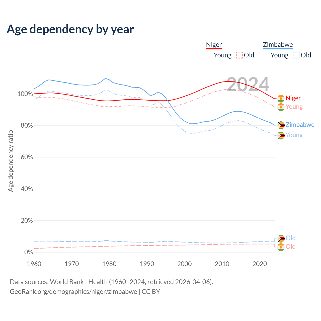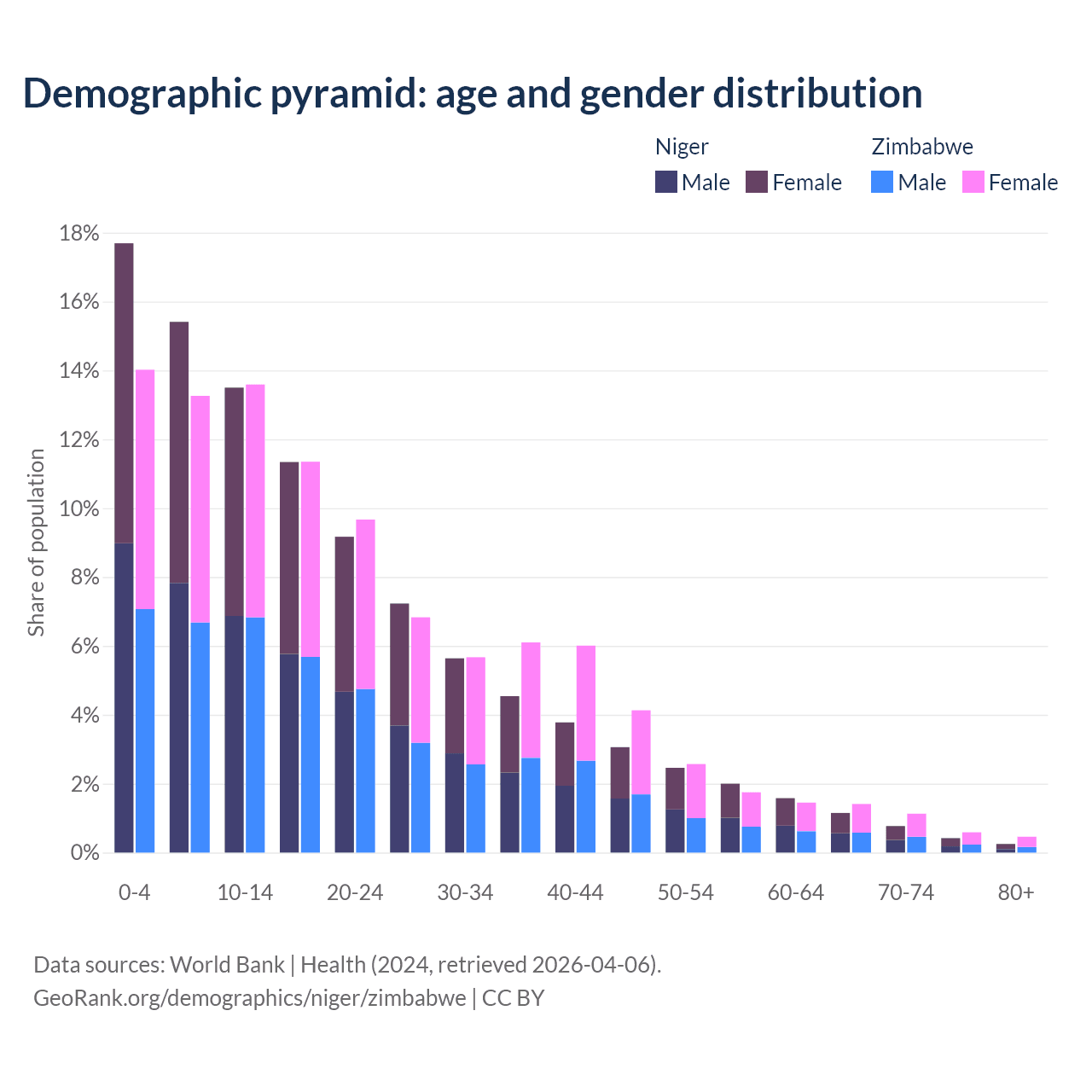 - Niger is ranked 195/196 by median age (oldest to youngest) vs 177/196 for Zimbabwe.