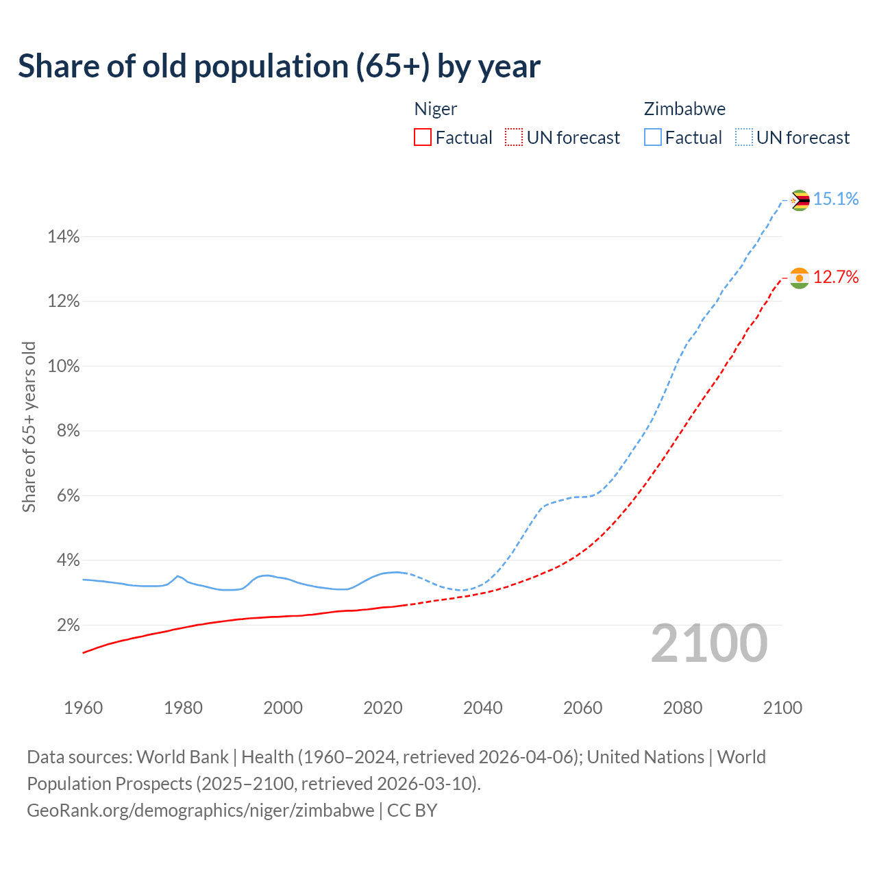 - The share of old-age demographic (65+) in Niger is 2.59% vs 3.6% in Zimbabwe.