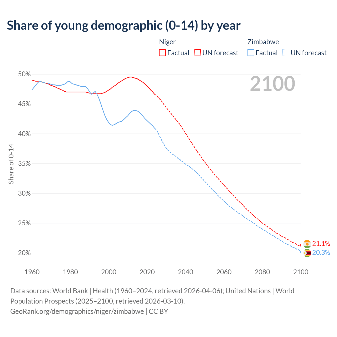 - The share of young demographic (0-15 years old) in Niger is 46.6% vs 40.9% in Zimbabwe.