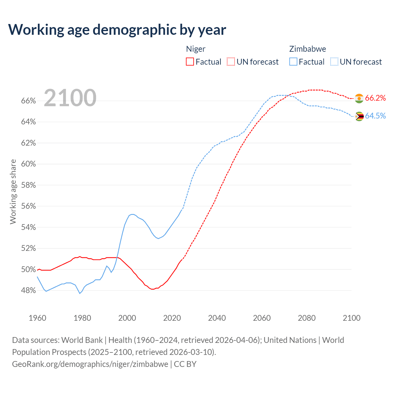 - Niger has 14.8M working age adults (aged 15-64) vs 9.64M in Zimbabwe.