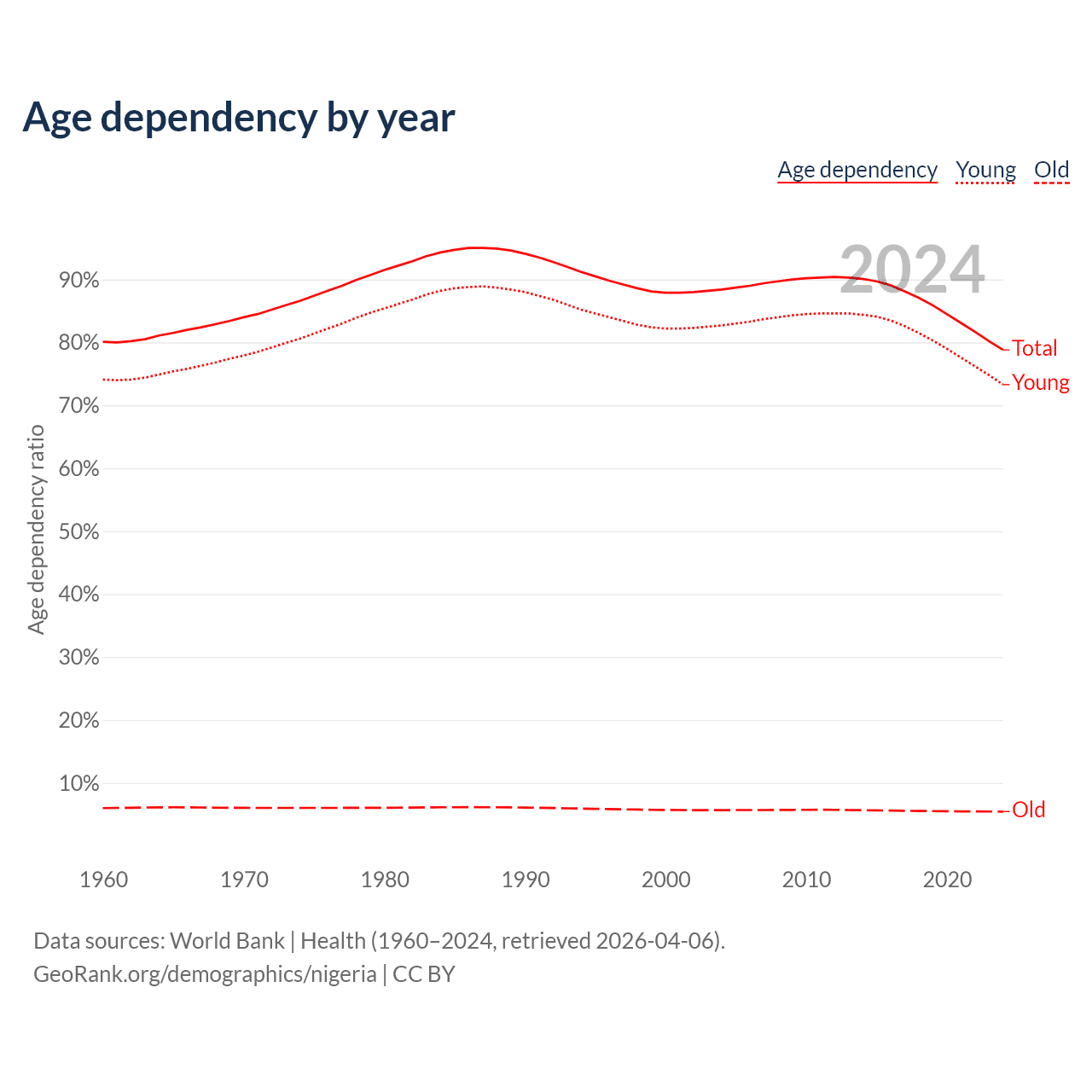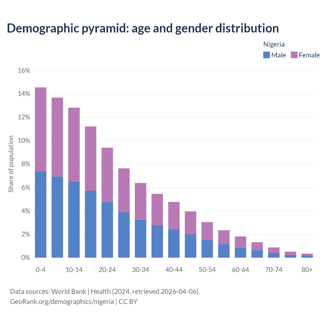 With a population of 233M people, Nigeria has a median age of 19 years which makes it the 178/196 oldest country. 41% of the demographic are children 0-14 years old, 55.9% are working-age people aged 15-64, and 3.05% are older population aged 65+ years.