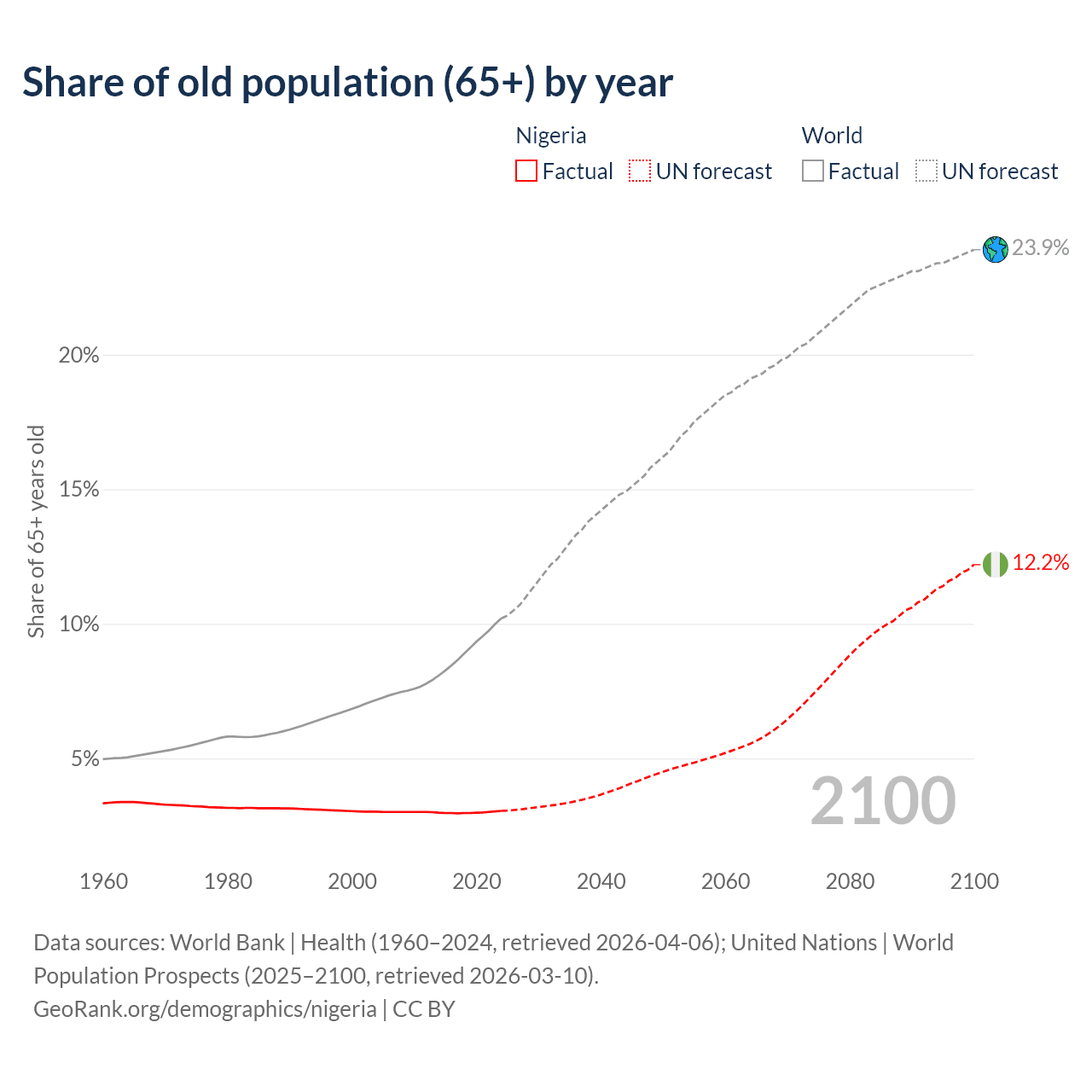 The share of older people aged 65 and over in Nigeria increased from 3.02% to 3.05% between 2004 and 2024.