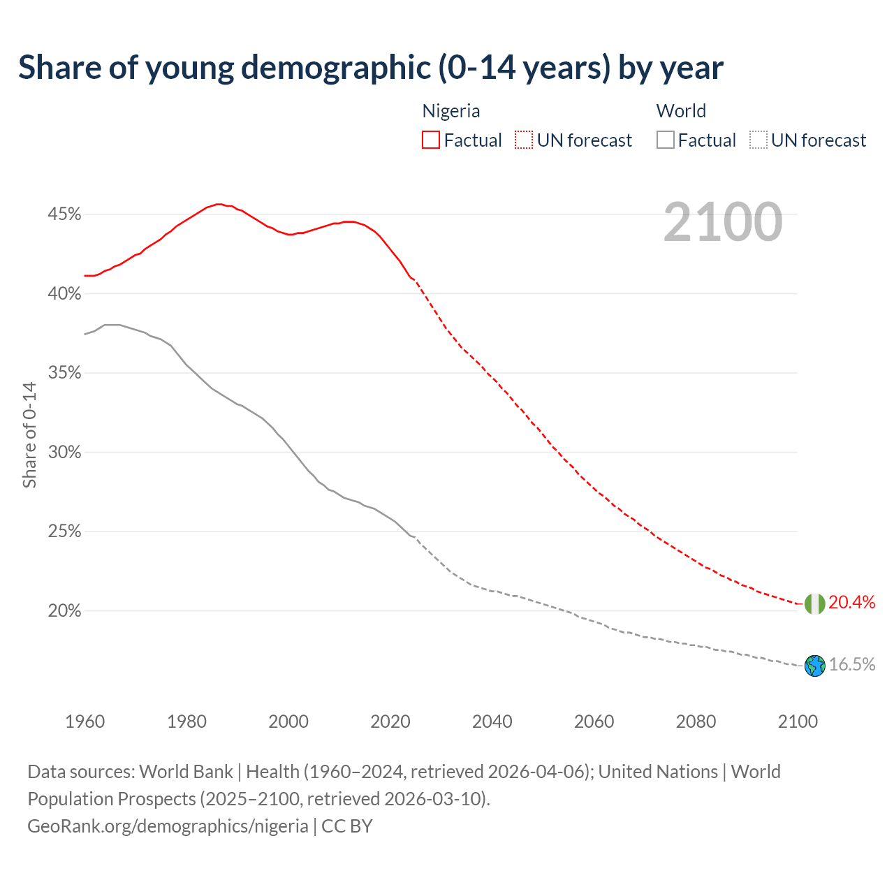 The share of children aged 0-14 in Nigeria decreased from 43.9% to 41% between 2004 and 2024 due to changes in birth rates.