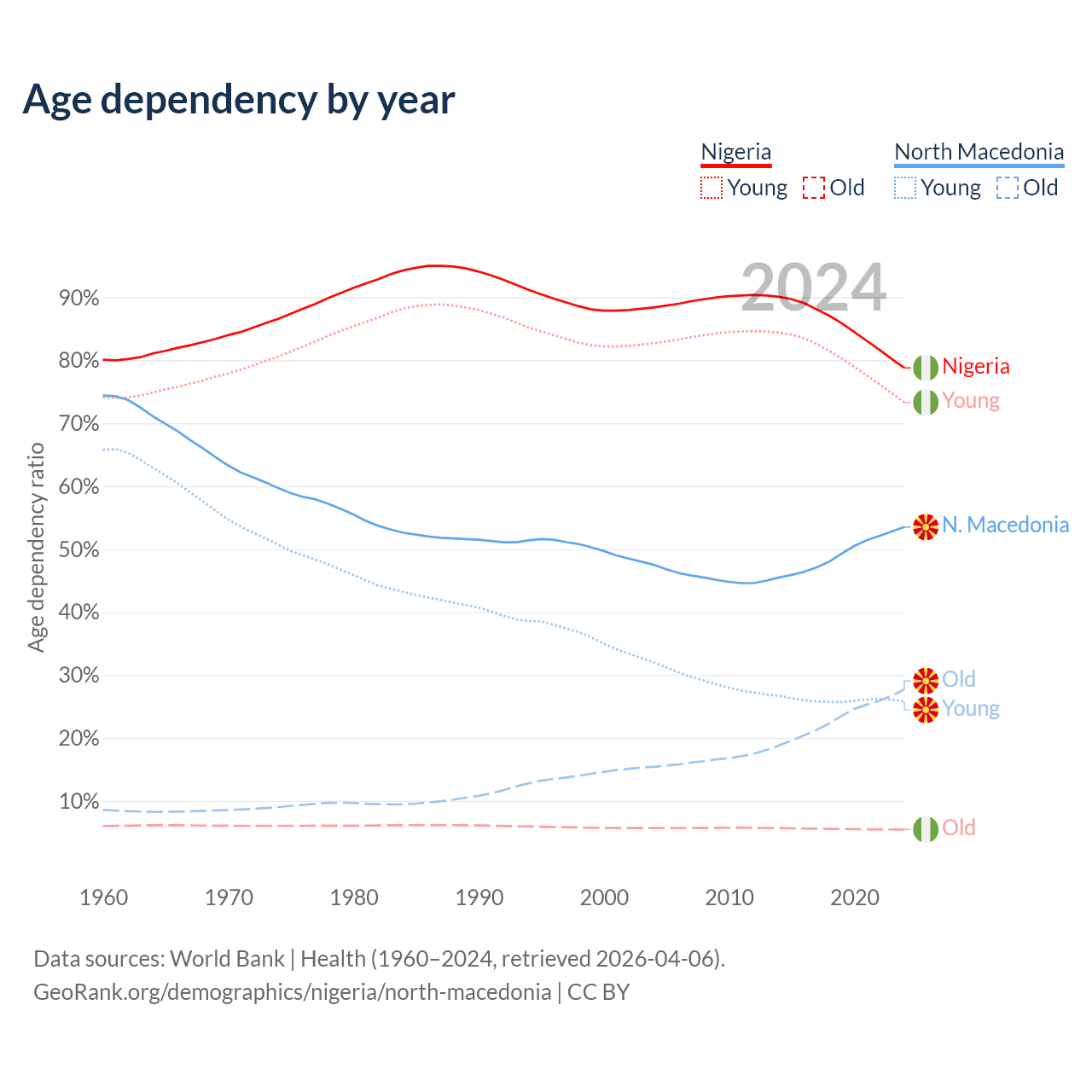 - Nigeria is ranked 178/196 by median age (oldest to youngest) vs 37/196 for North Macedonia.