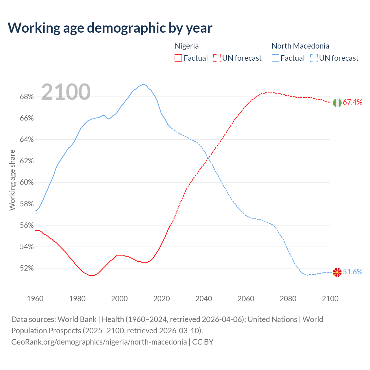 Median age Nigeria vs North Macedonia, 1960-2100