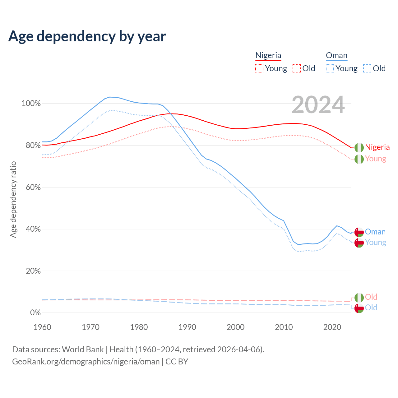 - Nigeria is ranked 178/196 by median age (oldest to youngest) vs 101/196 for Oman.
