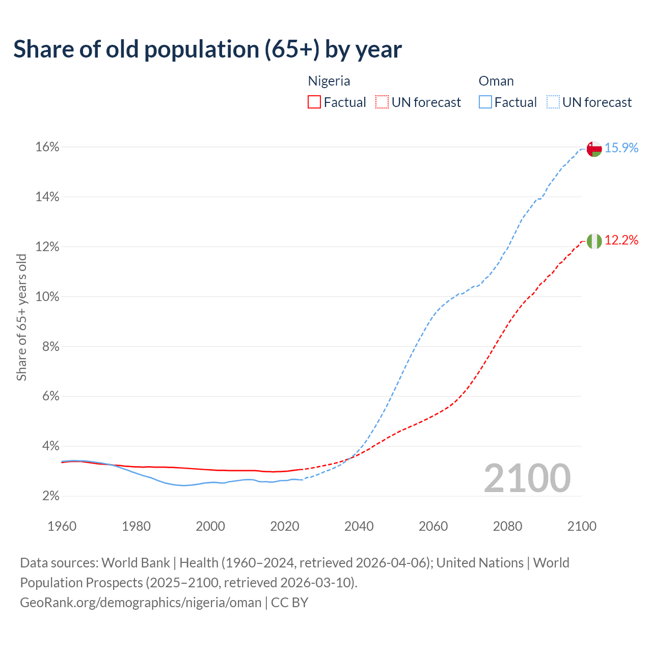 The share of older people aged 65 and over is 3.05% in Nigeria and 2.64% in Oman. Life expectancy in Nigeria compared to Oman .