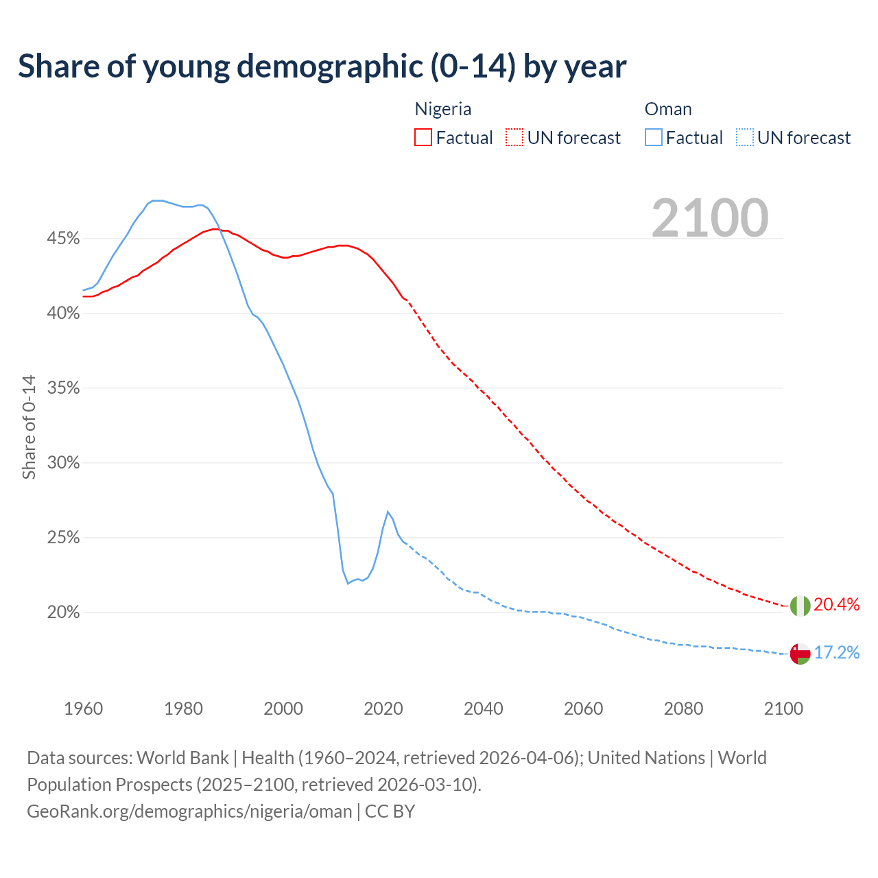 - The share of young demographic (0-15 years old) in Nigeria is 41% vs 24.7% in Oman.