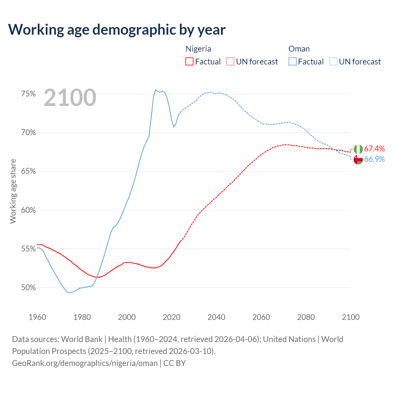 - Nigeria has 136M working age adults (aged 15-64) vs 4.19M in Oman.
