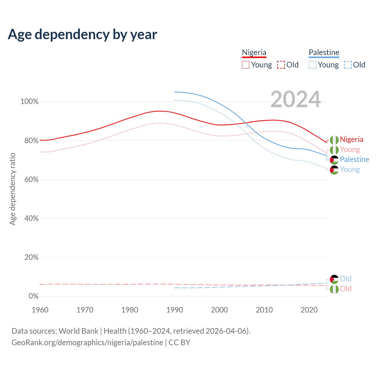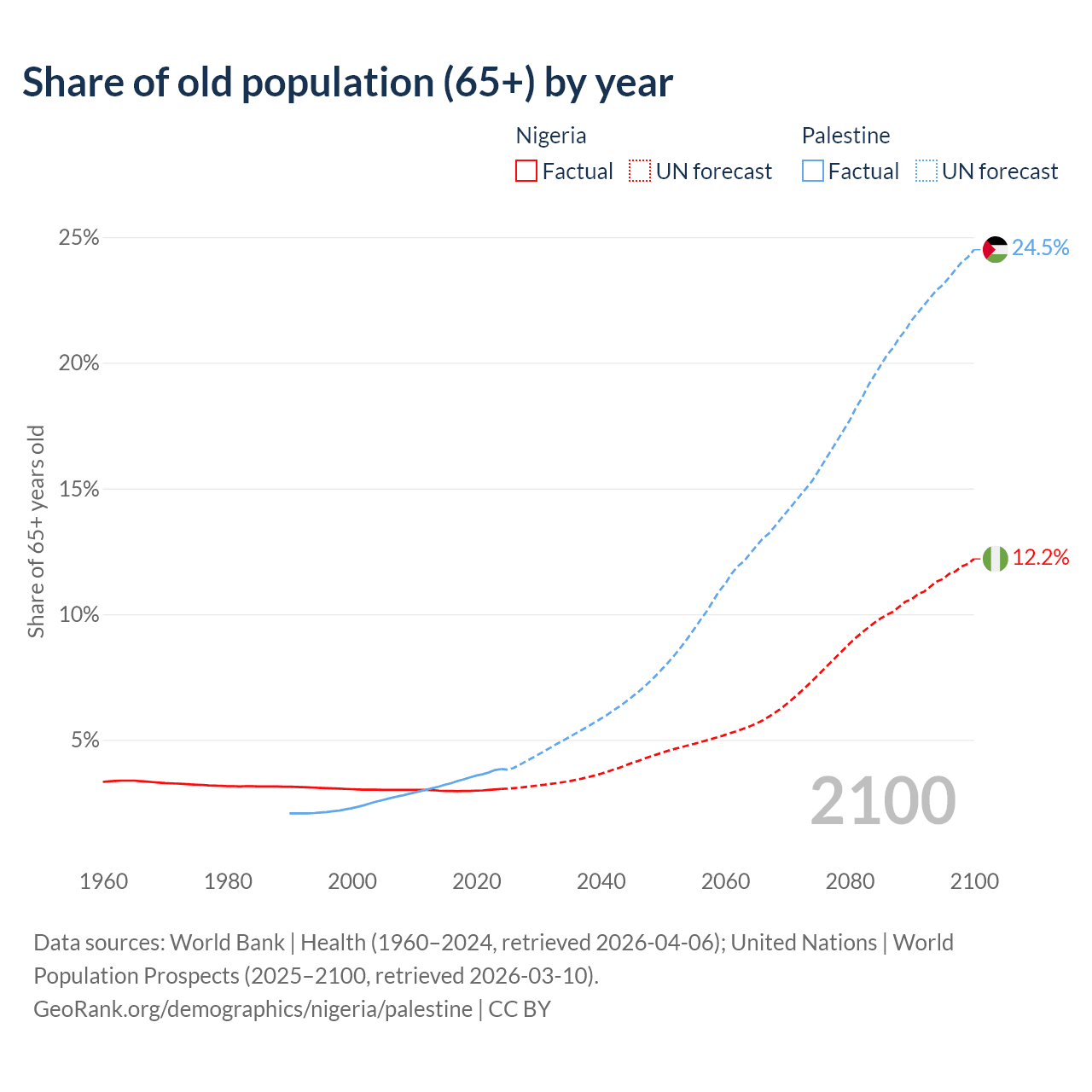 - The share of old-age demographic (65+) in Nigeria is 3.05% vs 3.84% in Palestine.