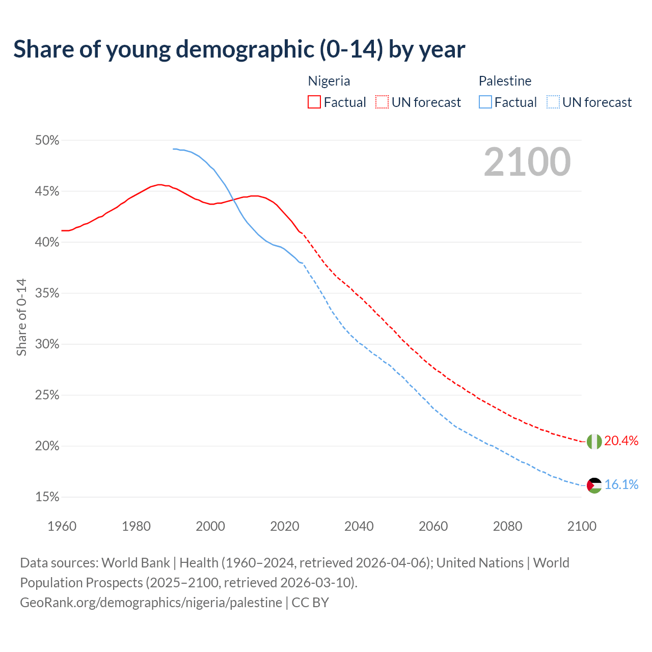 - The share of young demographic (0-15 years old) in Nigeria is 41% vs 38% in Palestine.
