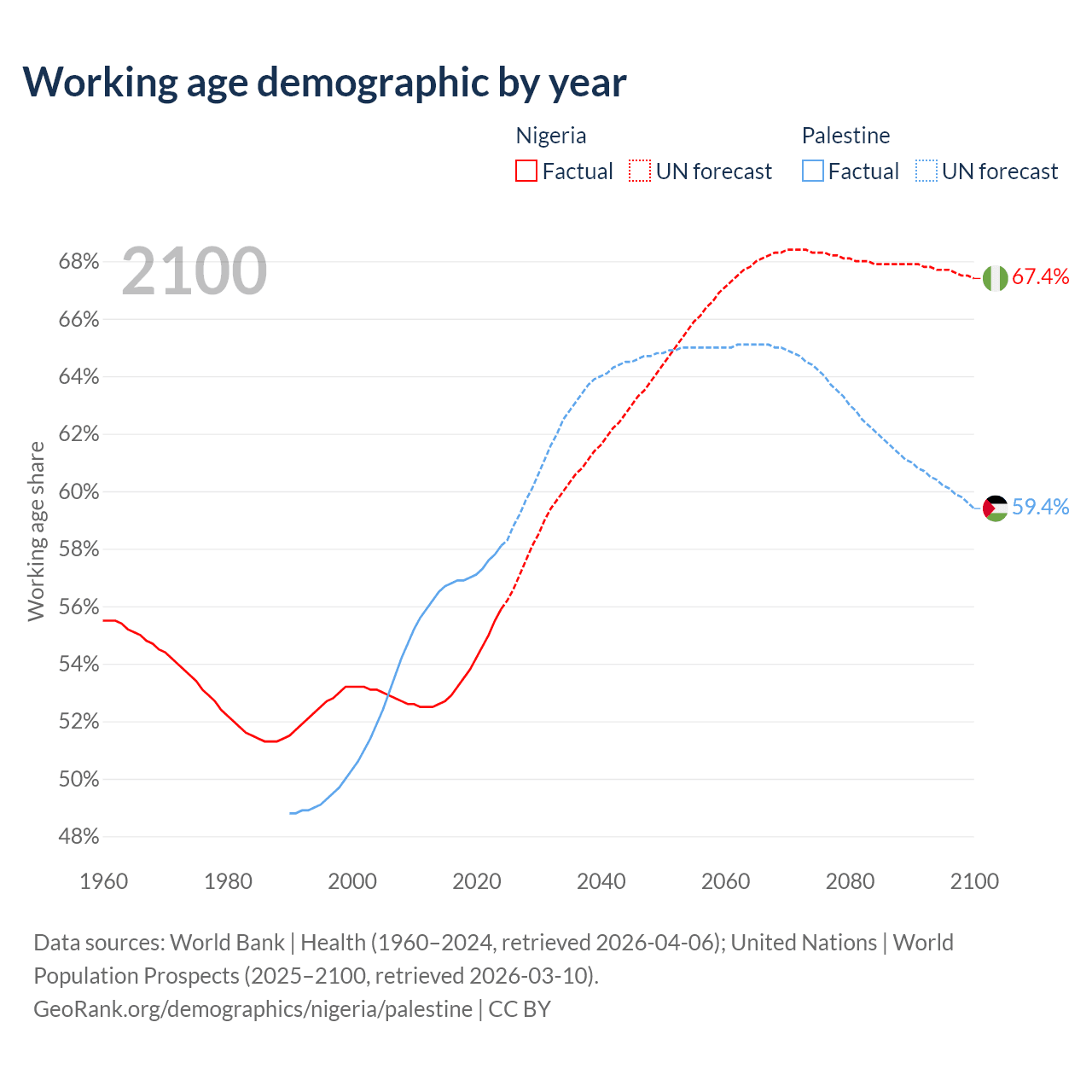 - Nigeria has 136M working age adults (aged 15-64) vs 3.2M in Palestine.